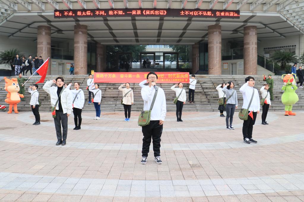 上午10时,团团(校团委吉祥物)和益益(校义协吉祥物)现身教学楼前,伴随着嘹亮的集结号,志愿者们背着“为人民服务”的书包,突然从人群中出现,深情朗诵雷锋语录,大声唱响“学习雷锋好榜样”的歌曲。熟悉的旋律吸引了众多师生,“哦,原来今天是雷锋日!”大家纷纷驻足观看,跟着一起歌唱,还拿出手机拍视频发抖音。“道路千万条,奋斗第一条,雷锋精神好,时代新风尚”,出现在快闪最后的横幅,赢得了现场的一片欢呼。集结的号角,激情的朗诵,嘹亮的歌声,精彩的表演,大学生们以他们喜欢的方式向雷锋致敬,呼唤雷锋精神在校园再次流行起来。