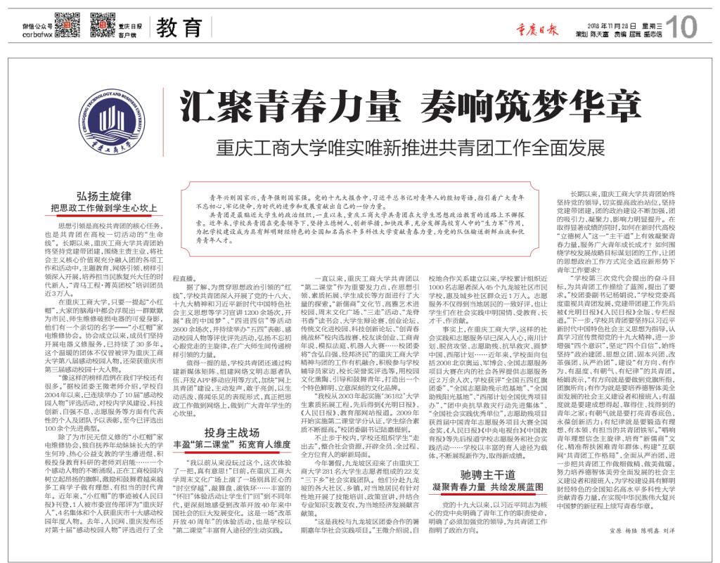 11月28日,在金年会第二次团代会、学代会召开之际,《重庆日报》以“汇聚青春力量 奏响筑梦华章”为题,教育版半版报道了金年会共青团在推进思想引领,“第二课堂”建设,“打造五有共青团”的发展蓝图等方面开展的具体工作及取得的成果,高度肯定了学校共青团的工作实效及“立德树人”的显著成效。