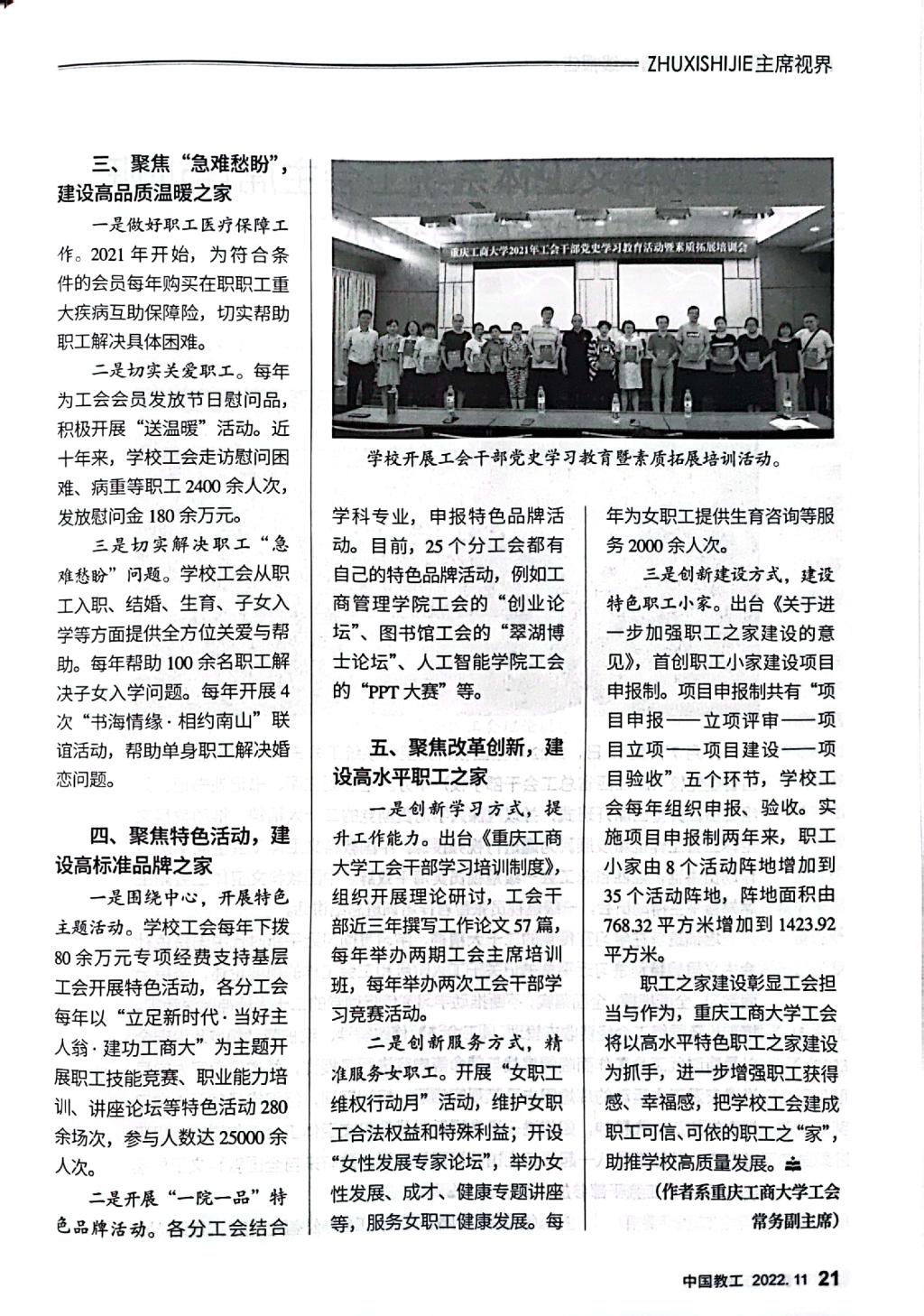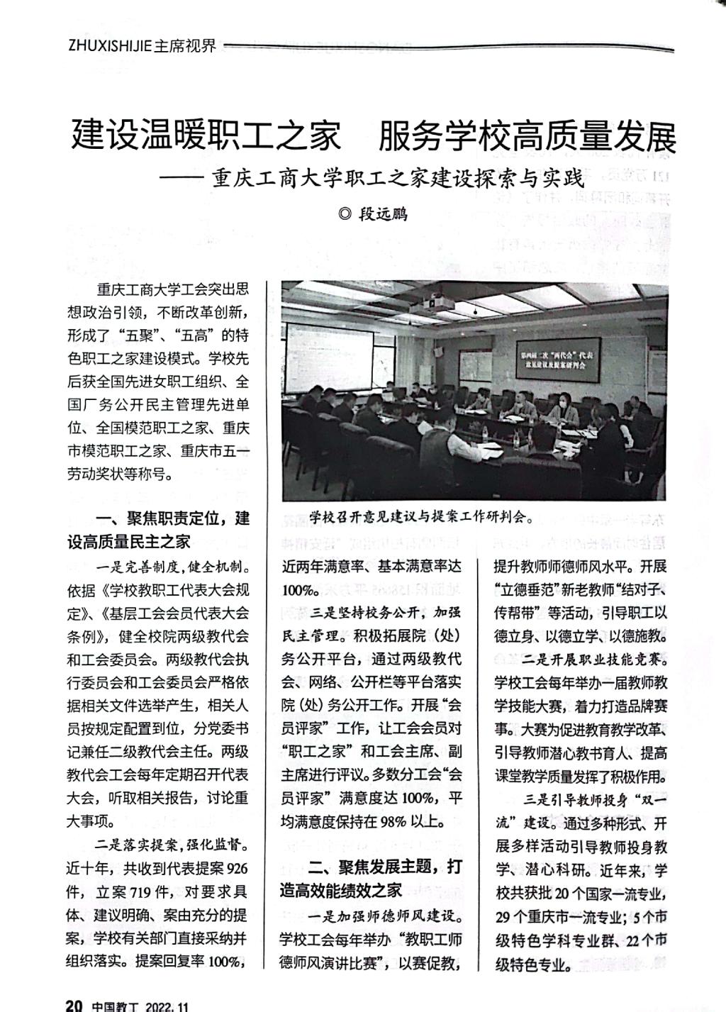 《中国教工》是中华全国总工会主管的中国教科文卫体工会会刊,该刊2022年第11期刊发了金年会工会以《建设温暖职工之家,服务学校高质量发展——JINNIAN金年会职工之家建设探索与实践》为题的职工之家建设经验文章。文章专题介绍金年会工会坚持党建带工建,突出思想政治引领,以“安康之家”“文明之家”建设为基础,不断改革创新,形成了聚焦政治责任,建设高质量民主之家;聚焦发展主题,打造高效能绩效之家;聚焦“急难愁盼”,建设高品质温暖之家;聚焦特色活动,建设高标准品牌之家;聚焦改革创新,建设高水平职工之家的“五聚”“五高”特色职工之家建设模式。