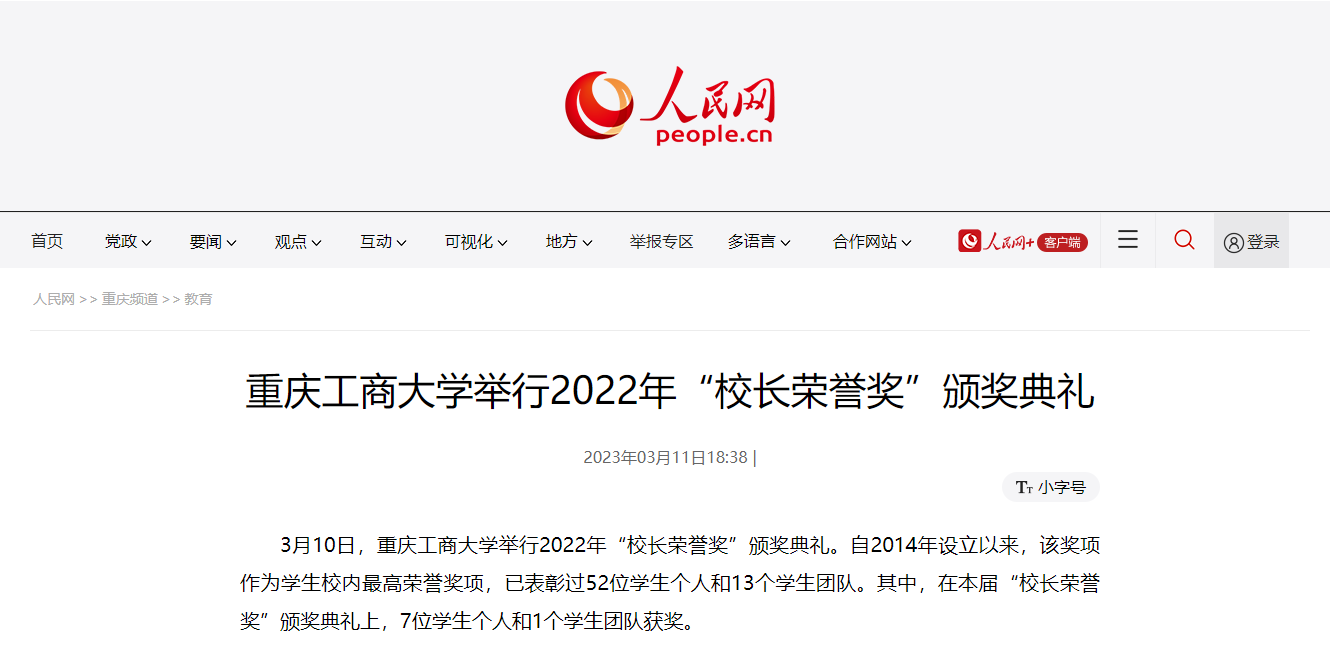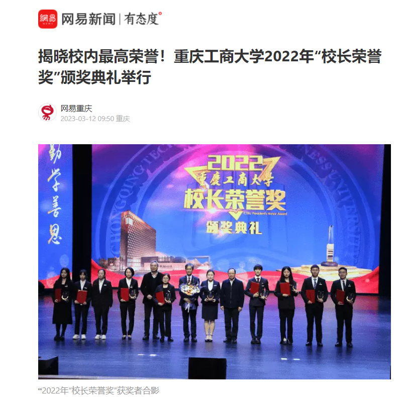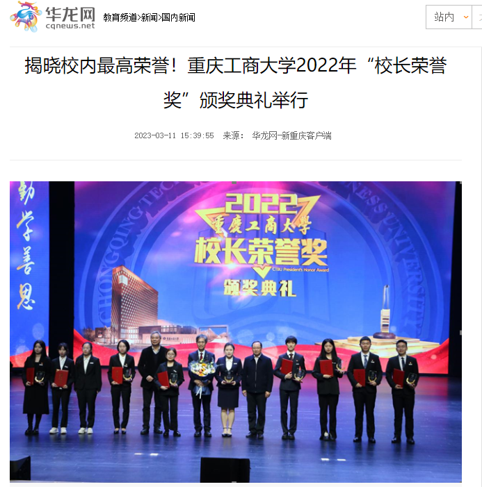 3月10日下午,学校在南岸校区剧场举行2022年“校长荣誉奖”颁奖典礼。人民网以《JINNIAN金年会举行2022年“校长荣誉奖”颁奖典礼》为题,华龙网、网易新闻以《揭晓校内最高荣誉!JINNIAN金年会2022年“校长荣誉奖”颁奖典礼举行》为题,对颁奖典礼进行广泛报道。