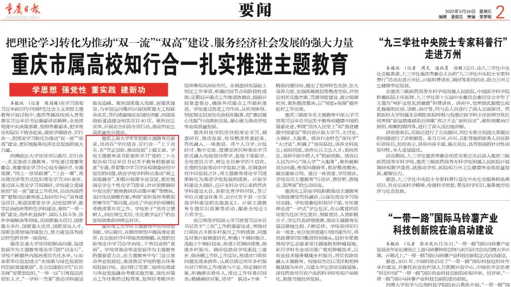 5月26日,重庆日报在第二版以《把理论学习转化为推动“双一流”“双高”建设、服务经济社会发展的强大力量 重庆市属高校知行合一扎实推进主题教育》为题,报道金年会扎实推进主题教育。报道中指出金年会牢牢把握主题教育总要求,坚持在“学用结合、知行合一”上下功夫、在“守正创新,推动发展”上做文章。学校主题教育读书班聚焦学习“党的二十大报告和习近平总书记关于教育的重要论述”专题,带着集中学习讨论和调查研究中发现的问题,结合学校学科特点推动“商工深度融合”,积极开展微专业设置,更好地满足学生个性化学习需求;针对前期调研中发现的“教师教研活动集中难”等情况,及时优化调整方案;围绕“如何发挥考核指挥棒作用”等问题,启动了学业评价和课程考核改革专项工作。学校班子“坚持立德树人,回应师生关切,优化教学运行”的态度和效果获得师生好评。