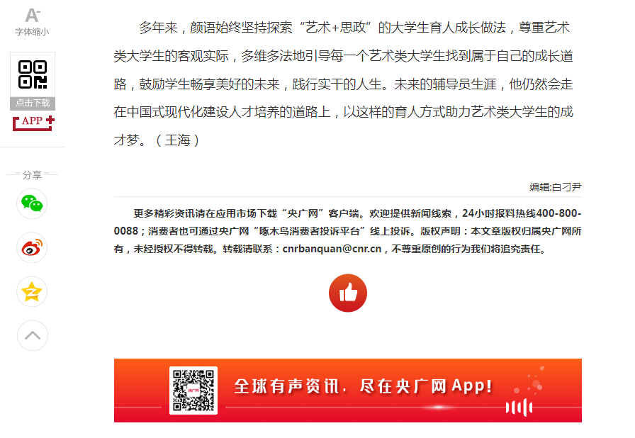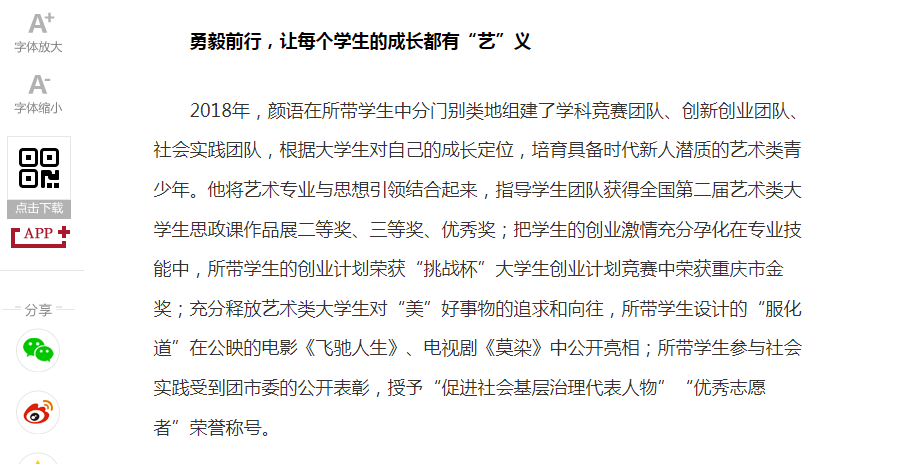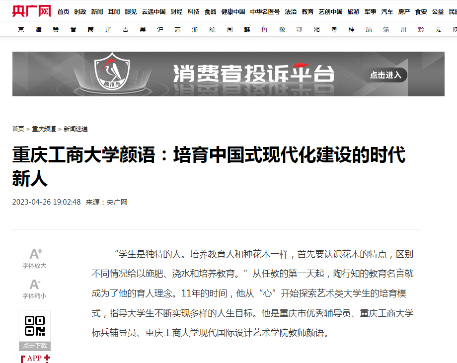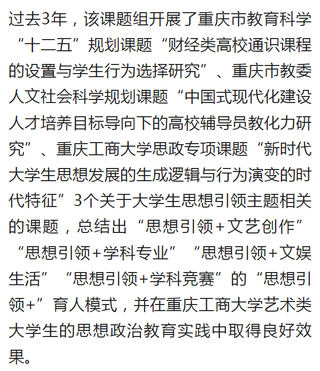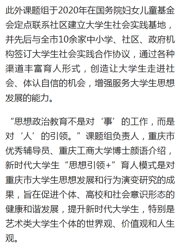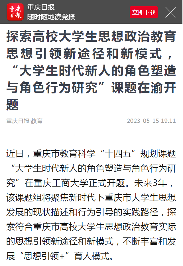 近日,重庆日报客户端、央广网报道了金年会探索大学生思想政治教育新途径和新模式的成果。该成果依托党委学工部立项的辅导员思想政治教育专项研究课题及辅导员工作室,围绕新时代大学生的思想变化和行为特征,探索“思想引领+文艺创作”、“思想引领+学科专业”、“思想引领+文娱生活”、“思想引领+学科竞赛”的融合育人模式,并将育人模式在国务院妇女儿童基金会定点联系的社区开展劳育活动进行实践,校社齐力共同探索时代新人培育的新途径。