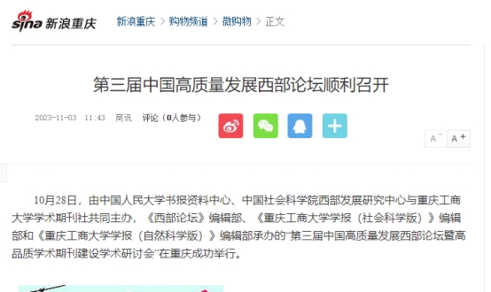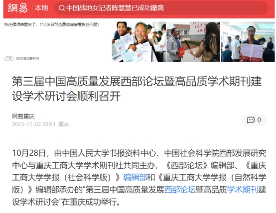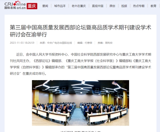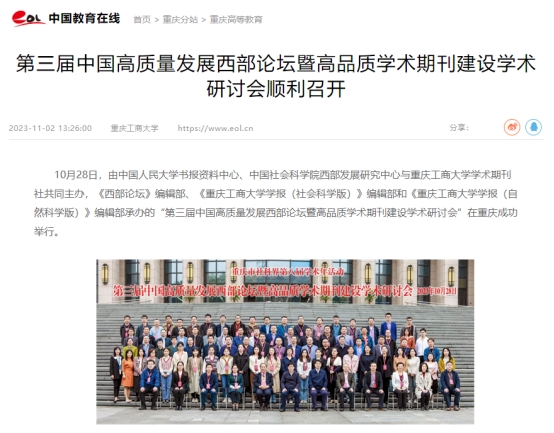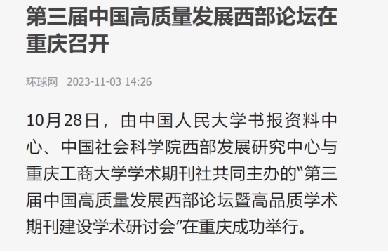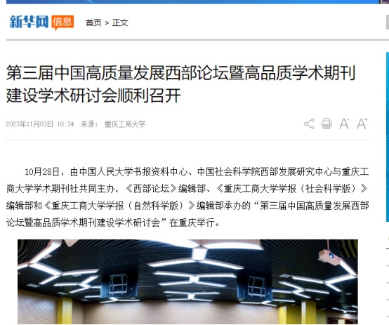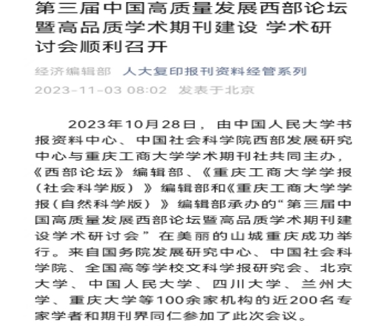 近日,由金年会学术期刊社与中国人民大学书报资料中心、中国社会科学院西部发展研究中心联合主办的“第三届中国高质量发展西部论坛暨高品质学术期刊建设学术研讨会”成功召开。中央广电总台国际在线以《第三届中国高质量发展西部论坛暨高品质学术期刊建设学术研讨会在渝举行》为题,新华网以《第三届中国高质量发展西部论坛暨高品质学术期刊建设学术研讨会顺利召开》为题,环球网以《第三届中国高质量发展西部论坛在重庆召开》为题,新浪网以《第三届中国高质量发展西部论坛顺利召开》为题,网易新闻以《第三届中国高质量发展西部论坛暨高品质学术期刊建设学术研讨会顺利召开》为题,中国教育在线以《第三届中国高质量发展西部论坛暨高品质学术期刊建设学术研讨会顺利召开》为题,予以广泛报道。另外,中国人民大学书报资料中心以《第三届中国高质量发展西部论坛暨高品质学术期刊建设学术研讨会顺利召开》为题进行了公开报道。
