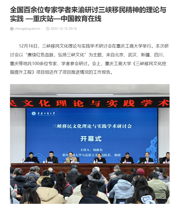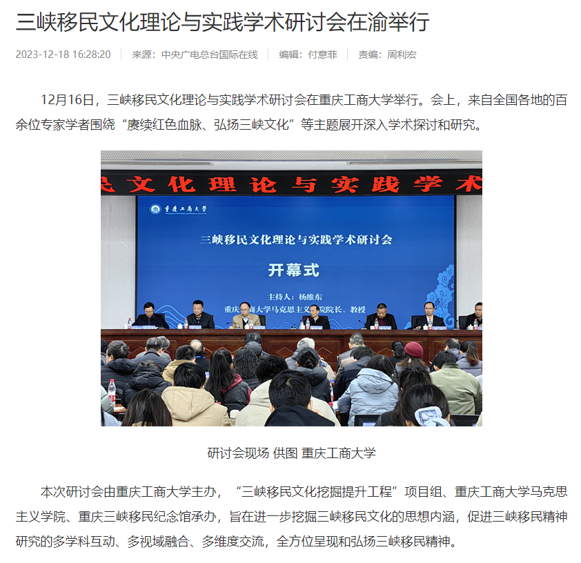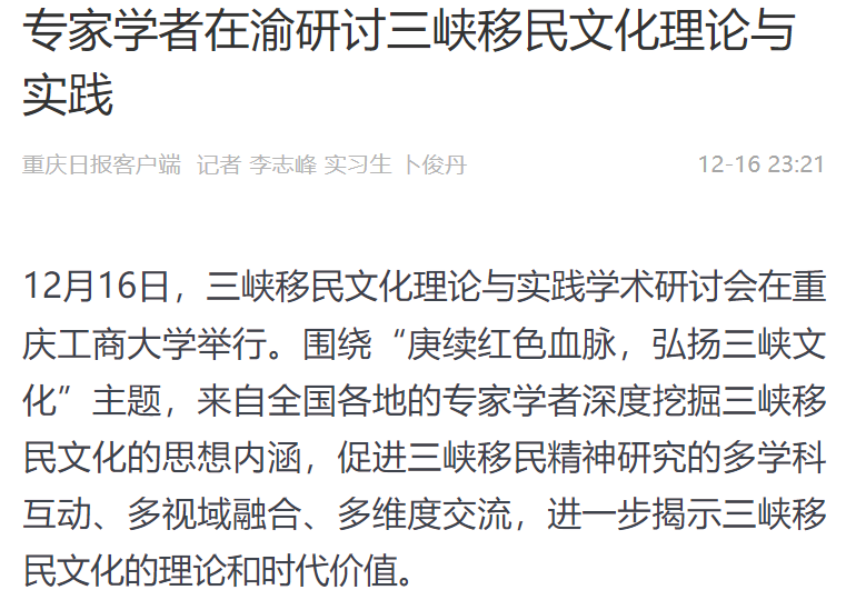 12月16日,三峡移民文化理论与实践学术研讨会在JINNIAN金年会召开,本次研讨会以“庚续红色血脉,弘扬三峡文化”为主题,由JINNIAN金年会主办,“三峡移民文化挖掘提升工程”项目组、JINNIAN金年会马克思主义学院、重庆三峡移民纪念馆承办。来自北京、武汉、四川、重庆、新疆等地共100余位领导、专家、学者参加了会议。中央广电总台国际在线、环球时报网、重庆日报客户端、华龙网、中国教育在线等多家媒体对本次论坛进行了报道。