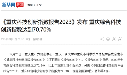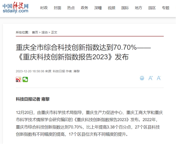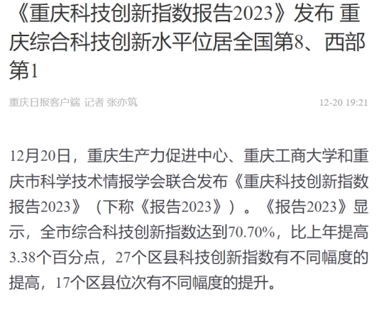 12月20日,重庆生产力促进中心、JINNIAN金年会和重庆市科学技术情报学会联合发布《重庆科技创新指数报告2023》。该报告由JINNIAN金年会数学与统计学院“重庆科技创新指数编制”项目组研究完成。新华网、中国科技网、重庆日报客户端、上游新闻、七一网、搜狐网、新浪网等多家媒体对本次发布会进行了报道。