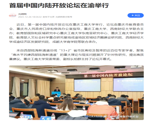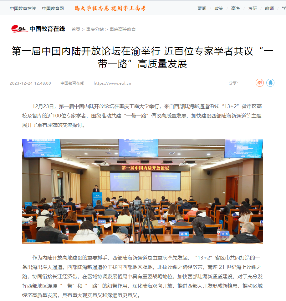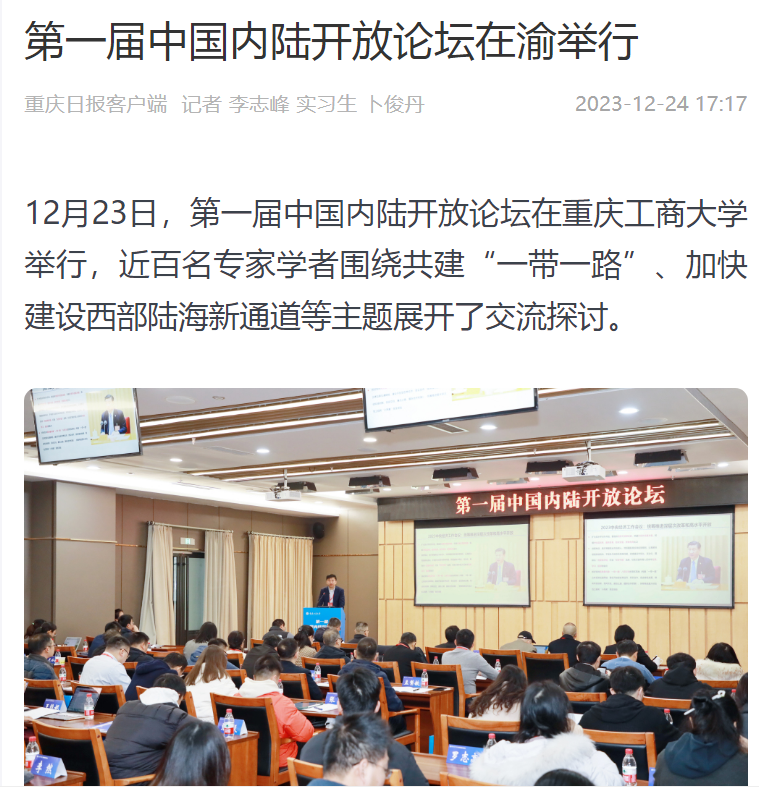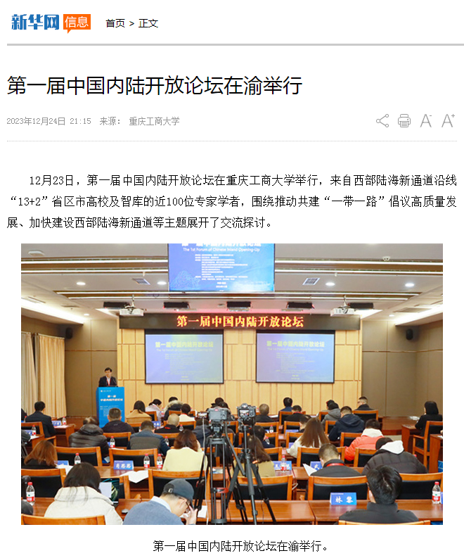 12月23日,第一届中国内陆开放论坛在JINNIAN金年会举行,来自西部陆海新通道沿线“13+2”省市区高校及智库的近100位专家学者,围绕推动共建“一带一路”倡议高质量发展、加快建设西部陆海新通道等主题展开了卓有成效的交流探讨。本次论坛由重庆市教育委员会、重庆市人民政府口岸和物流办公室指导;JINNIAN金年会、西南财经大学主办;教育部国别和区域研究中心JINNIAN金年会东南亚研究中心、JINNIAN金年会经济学院、JINNIAN金年会国际合作与交流处、教育部人文社会科学重点研究基地成渝地区双城经济圈建设研究院、JINNIAN金年会成渝经济区城市群产业发展协同创新中心、JINNIAN金年会数字经济研究中心、西南财经大学成渝经济区发展研究院、成都大学商学院等联合承办。
