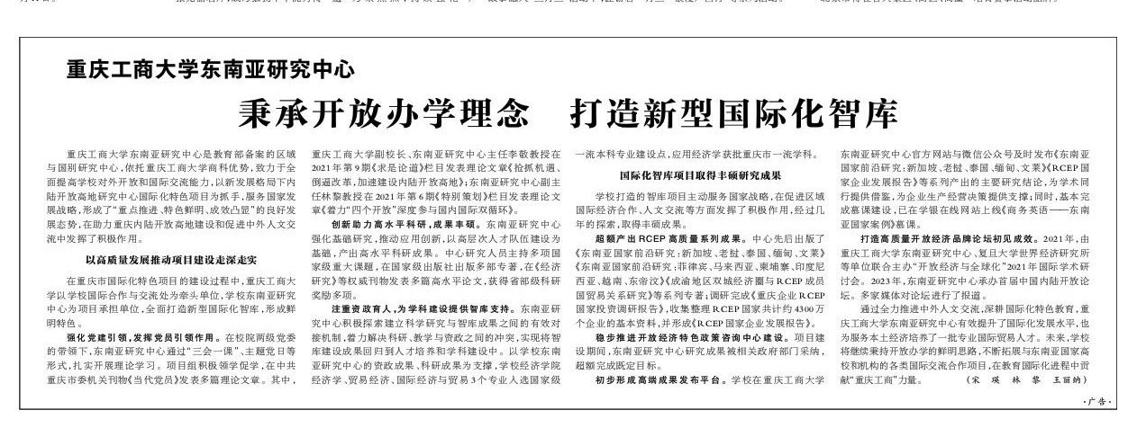 3月29日,《光明日报》第九版以《JINNIAN金年会东南亚研究中心:秉承开放办学理念打造新型国际化智库》为题,报道金年会东南亚研究中心重庆市国际化特色项目建设成果。JINNIAN金年会东南亚研究中心是教育部区域与国别研究中心,依托JINNIAN金年会商科优势,致力于全面提高学校对外开放和国际交流能力,以新发展格局下内陆开放高地研究中心国际化特色项目为抓手,服务国家发展战略,形成了“重点推进、特色鲜明、成效凸显”的良好发展态势,在助力重庆内陆开放高地建设和促进中外人文交流中贡献了“重庆工商大”力量。