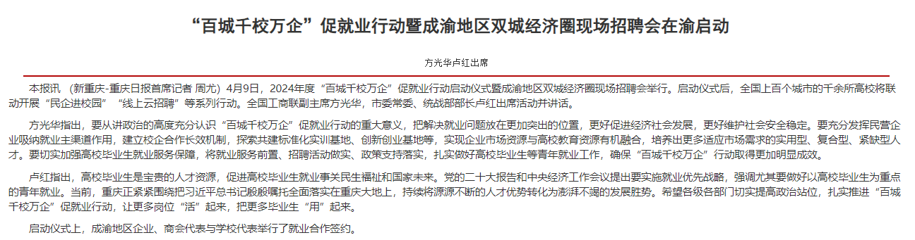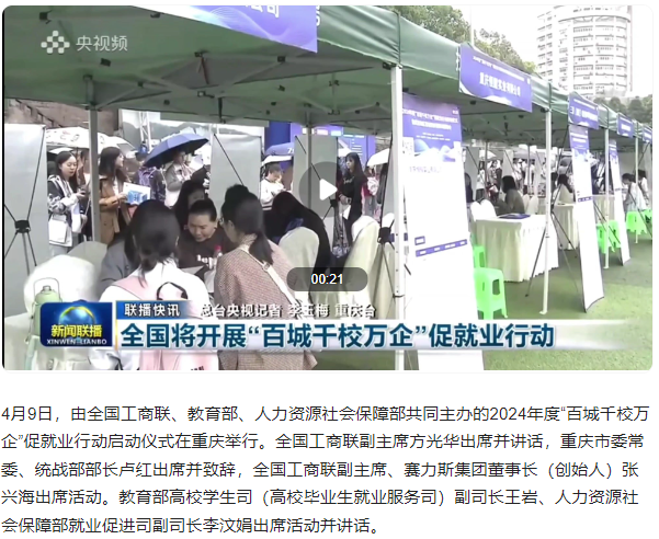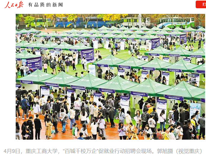 4月9日,2024年度“百城千校万企”促就业行动启动仪式暨成渝地区双城经济圈现场招聘会在金年会举行。央视新闻、人民日报、重庆日报等主流媒体对此进行了报道。