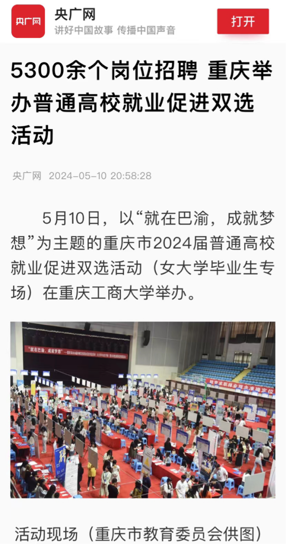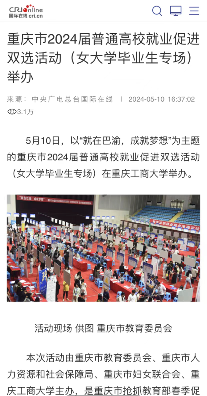 5月10日,央广网、中央广电总台国际在线等主流媒体以“就在巴渝,成就梦想”为主题,报道金年会顺利承办重庆市2024届普通高校就业促进双选活动(女大学毕业生专场)。