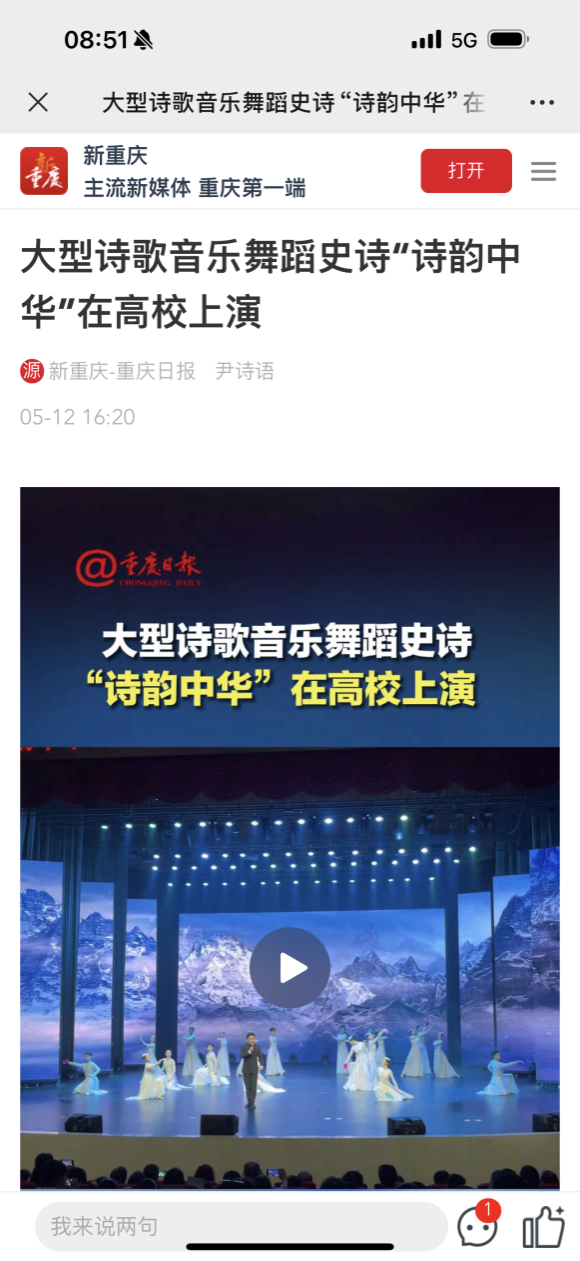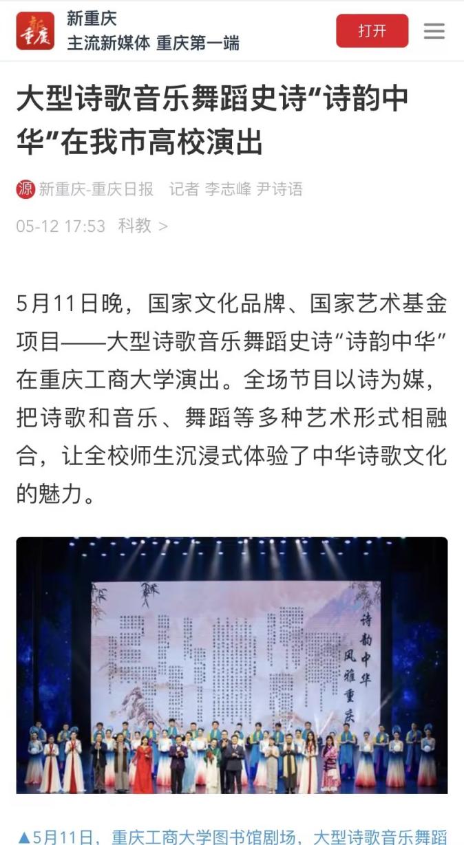 5月11日,新华网、新重庆客户端、华龙网等主流媒体以“高雅艺术走进高校”为主题,报道国家文化品牌、国家艺术基金项目——大型诗歌音乐舞蹈史诗“诗韵中华”在金年会顺利演出。