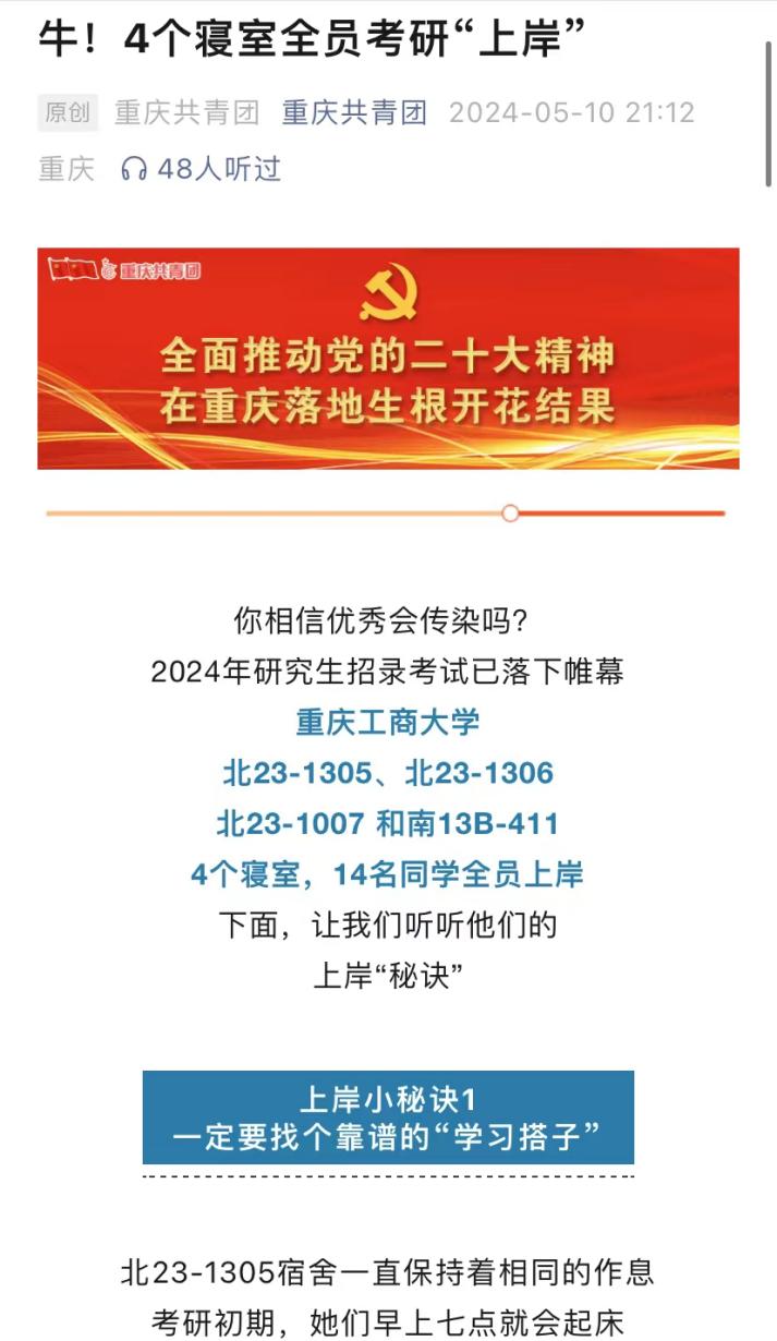 重庆共青团微信公众号以《牛!4个寝室全员考研“上岸”》为题报道了金年会考研捷报。