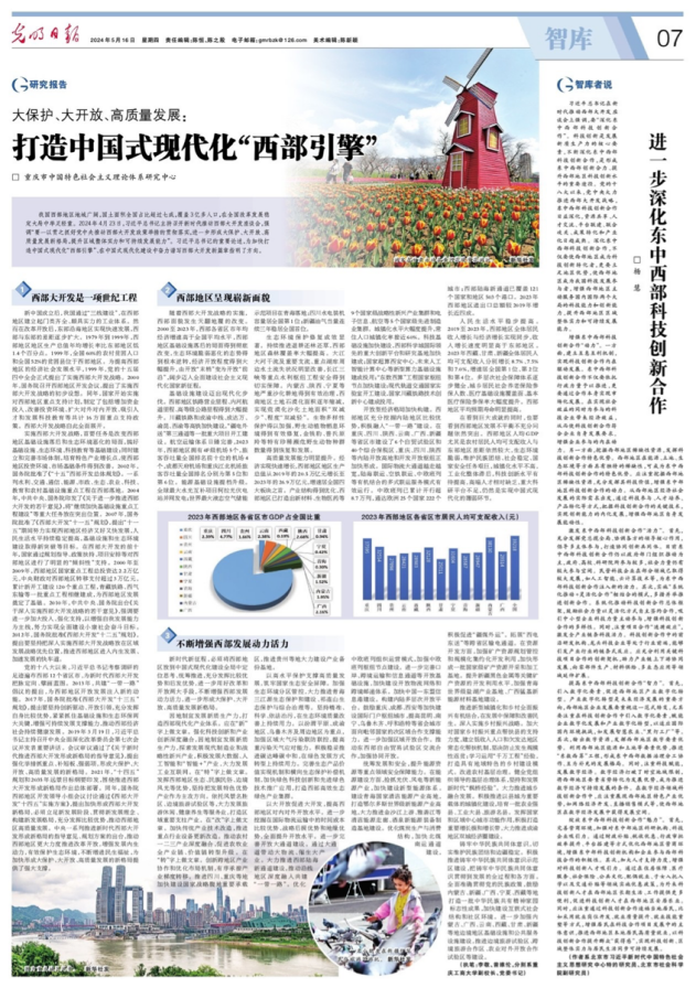 5月16日,《光明日报》智库版刊登金年会副校长李敬和党委书记曾维伦撰写的关于贯彻落实习近平总书记重要讲话重要指示精神的研究报告《大保护、大开放、高质量发展:打造中国式现代化“西部引擎”》。该报告聚焦加快打造中国式现代化“西部引擎”、在中国式现代化建设中奋力谱写西部大开发新篇章这个主题,从“西部大开发是一项世纪工程”“西部地区呈现崭新面貌”“不断增强西部发展动力活力”等三个方面展开论述。