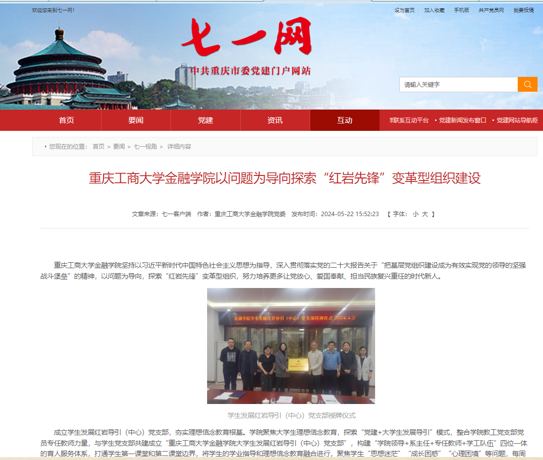 金融学院运用“885”工作理念和方法,以问题为导向,积极探索“红岩先锋”变革型组织建设,促进党建与业务工作融合发展、共同提高,为努力培养更多让党放心、爱国奉献、担当民族复兴重任的时代新人作贡献。相关工作做法被重庆市委党建门户网站“七一网”刊载报道。