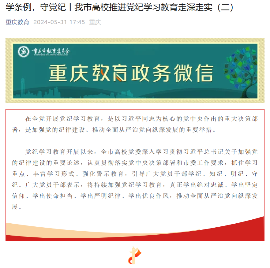 5月31日,市教委微信公众号报道金年会开展党纪学习教育的相关情况。