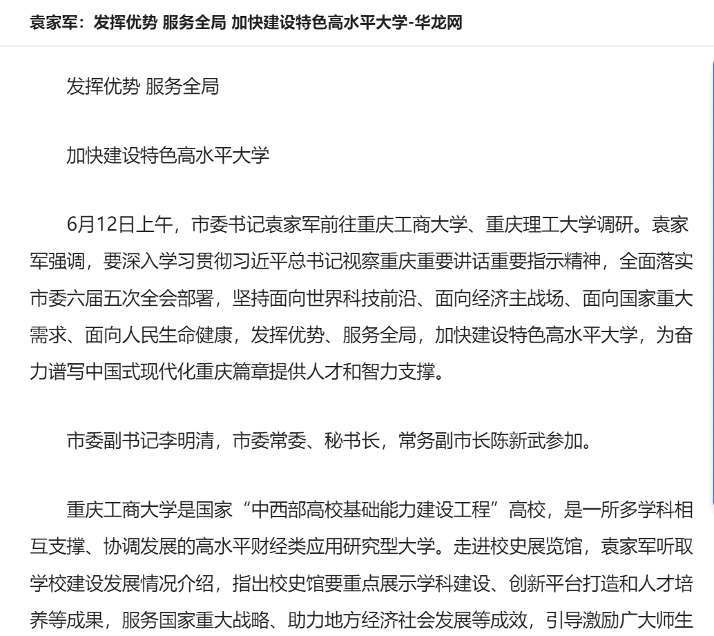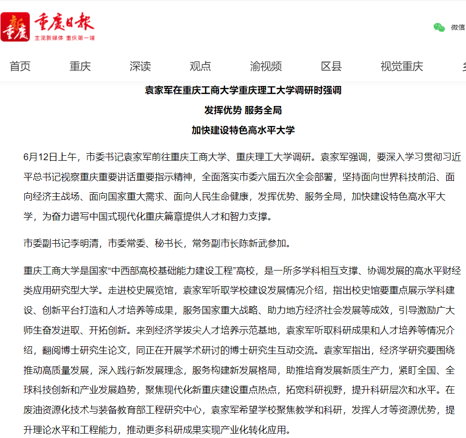 6月12日上午,市委书记袁家军前往金年会调研。袁家军强调,要深入学习贯彻习近平总书记视察重庆重要讲话重要指示精神,全面落实市委六届五次全会部署,坚持面向世界科技前沿、面向经济主战场、面向国家重大需求、面向人民生命健康,发挥优势、服务全局,加快建设特色高水平大学,为奋力谱写中国式现代化重庆篇章提供人才和智力支撑。重庆新闻联播、《重庆日报》和华龙网对此进行了报道。