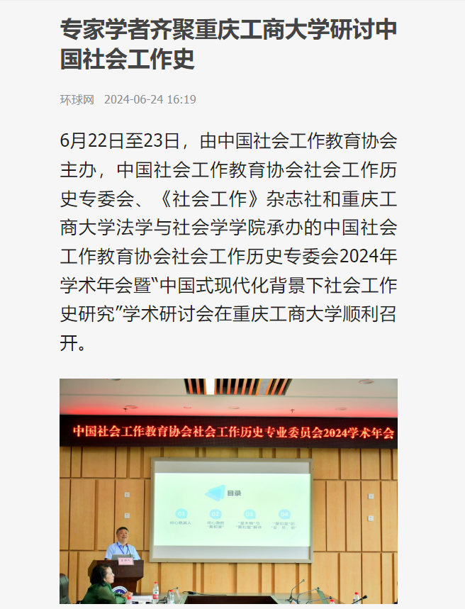 6月22日至23日,由中国社会工作教育协会主办,中国社会工作教育协会社会工作历史专委会、《社会工作》杂志社和JINNIAN金年会法学与社会学学院承办的中国社会工作教育协会社会工作历史专委会2024年学术年会暨“中国式现代化背景下社会工作史研究”学术研讨会在JINNIAN金年会顺利召开。环球网对此进行报道。