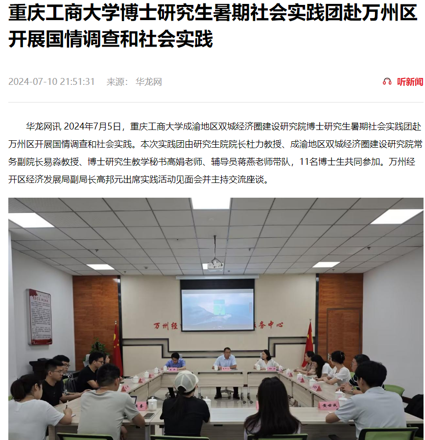 7月5日,学校成渝地区双城经济圈建设研究院博士研究生暑期社会实践团赴万州区开展国情调查和社会实践。华龙网对本次活动进行了报道。