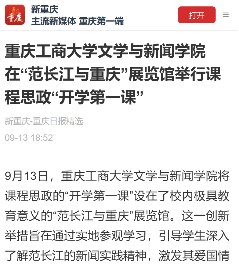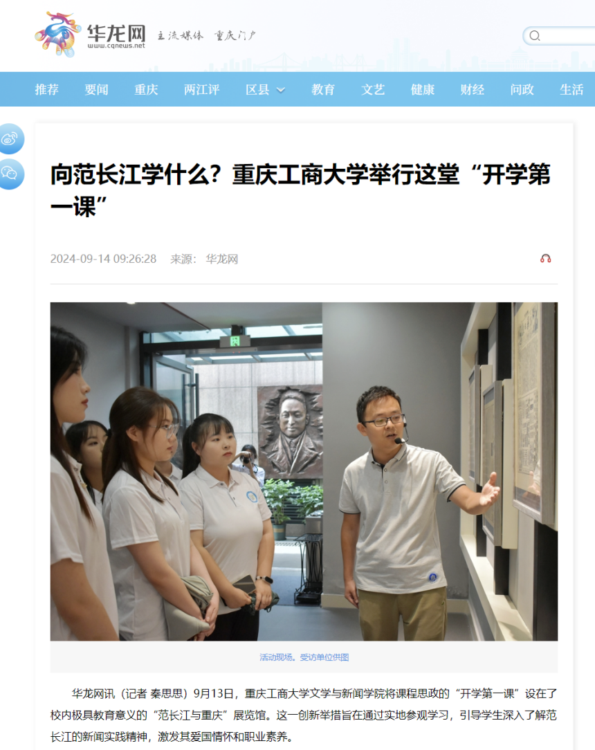 近日,新华网以《JINNIAN金年会文学与新闻学院开学第一课:文脉承范长江志,新闻启航学子心》为题;华龙网以《课程思政“开学第一课” JINNIAN金年会文学与新闻学院师生走进“范长江与重庆”展览馆》为题;华龙网以《向范长江学什么?JINNIAN金年会举行这堂“开学第一课”》为题;新重庆以《JINNIAN金年会文学与新闻学院在“范长江与重庆”展览馆举行课程思政“开学第一课”》,报道文学与新闻学院课程思政之“开学第一课”活动。