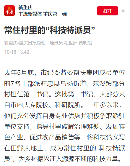 2023年5月,作为市纪委监委帮扶集团成员单位,金年会选派赵甫刚、张杰、朱沙、陈琛四位中层干部到忠县担任第一驻村书记。一年多来,驻村干部充分发挥自身专业优势并积极争取派驻单位支持,指导村里破解治理难题、发展特色产业、促进农产品销售等,将科技论文写在田野大地上,成为常住村里的“科技特派员”,为乡村振兴注入源源不断的科技力量。近日,重庆日报新重庆客户端对此进行了报道。