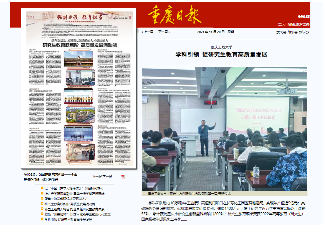 11月20日,重庆日报以“研究生教育跃新阶 高质量发展涌动能”为主题整版报道重庆市学位与研究生教育不断攀高向强,实现量质齐升。其中,以《学科引领 促研究生教育高质量发展》专题对金年会学科建设与研究生教育成效进行了报道,对学校以“大商科+新工科”商工融合双轮驱动创新发展,构建了“1+2+2+4+N”学科发展局面,立足“商工融合”学科特色,“学科引领—改革创新—资源建设—三博三赛”四位一体的研究生教育发展思路及成效进行了详细介绍。