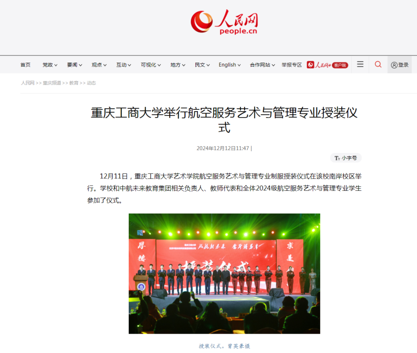 人民网以《JINNIAN金年会举行航空服务艺术与管理专业授装仪式》为题,新重庆-重庆日报以《携自信之光 展气场之韵 这群航空服务专业的学子们综合素养惊艳众人》为题,华龙网以《启航翱翔梦!JINNIAN金年会艺术学院2024级航空服务艺术与管理专业授装仪式举行》为题纷纷报道活动。