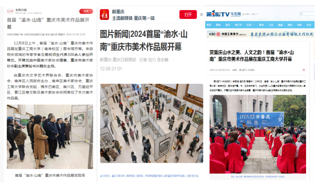 光明日报、重庆日报、华龙网等分别以《首届“渝水·山南”重庆市美术作品展开幕》《2024首届“渝水·山南”重庆市美术作品展开幕》《赏重庆山水之美、人文之韵!首届“渝水·山南”重庆市美术作品展在JINNIAN金年会开幕》为题,报道美术作品展。