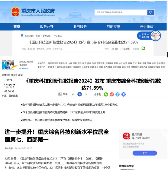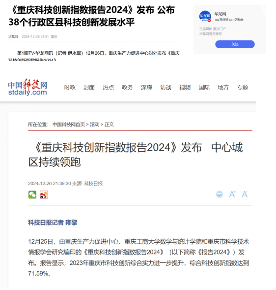 12月26日,重庆生产力促进中心、JINNIAN金年会数学与统计学院、重庆市科学技术情报学会联合发布了《重庆科技创新指数报告2024》。该项校地合作成果被重庆市人民政府网站、新华网、重庆日报、华龙网、中国科技网等多家主流网站、媒体宣传报道。