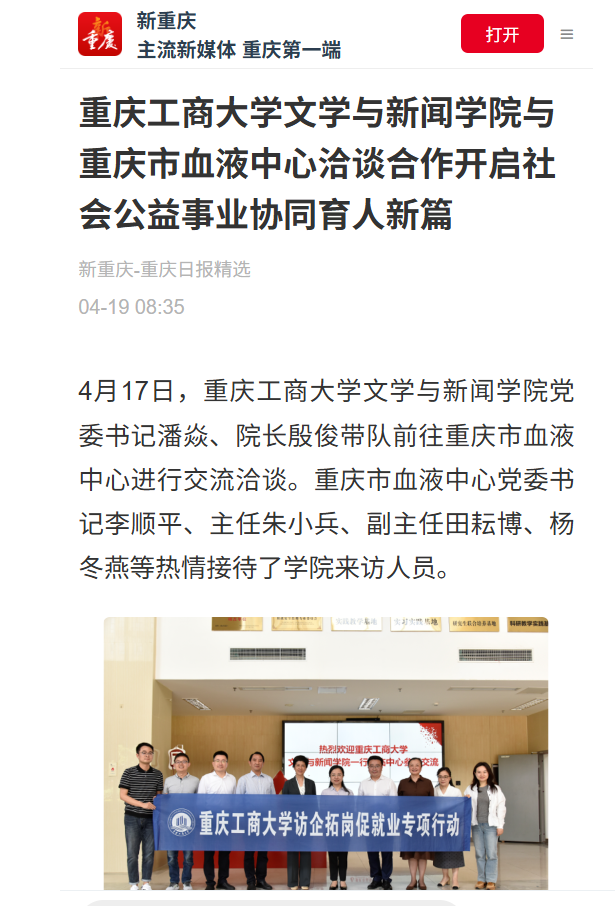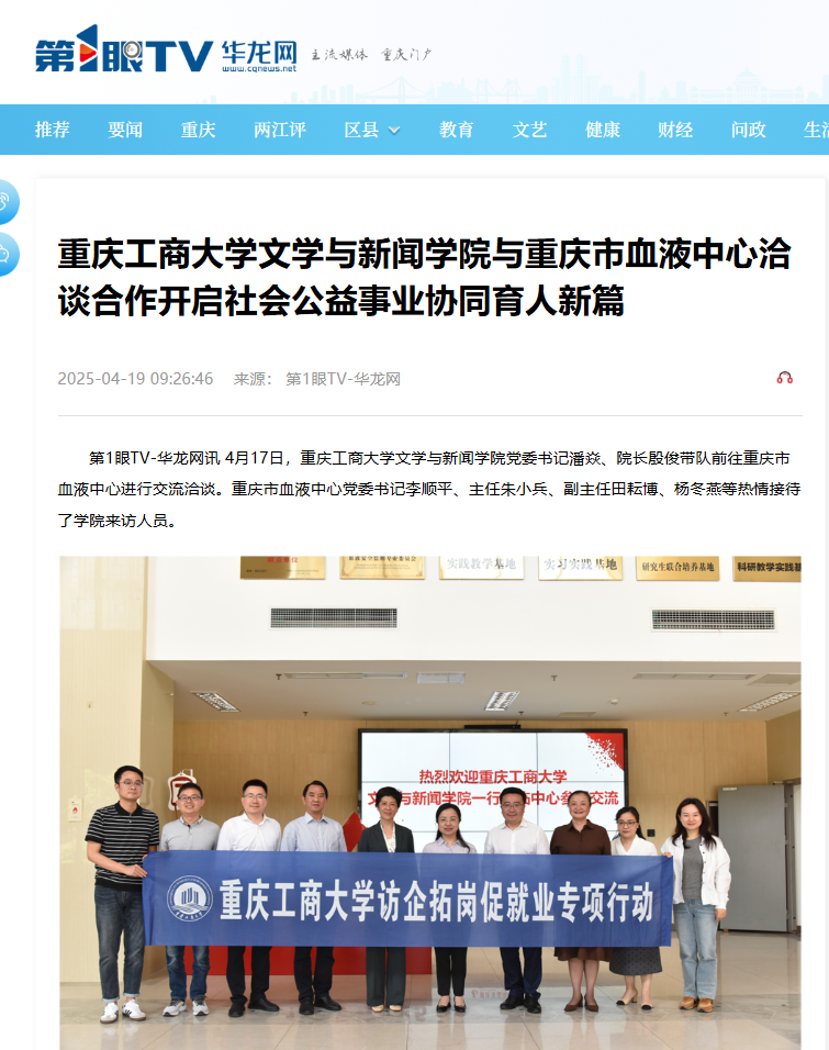 新重庆—重庆日报、第一眼TV-华龙网等媒体以《JINNIAN金年会文学与新闻学院与重庆市血液中心洽谈合作开启社会公益事业协同育人新篇》为题对此次活动进行了报道。