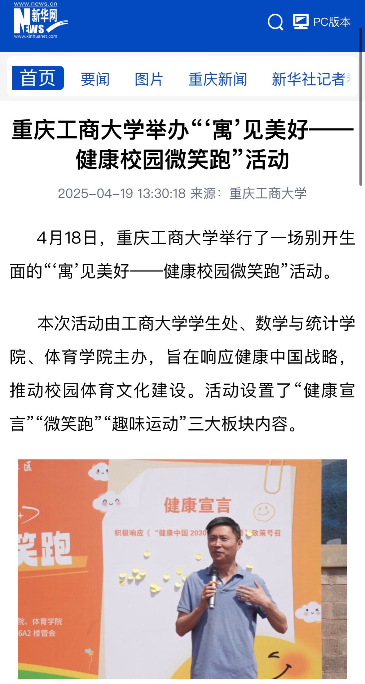 4月18日,由学校学生处、数学与统计学院、体育学院主办的“寓”见美好——健康校园微笑跑活动在南岸校区南区操场举行。活动旨在响应健康中国战略,推动校园体育文化建设。