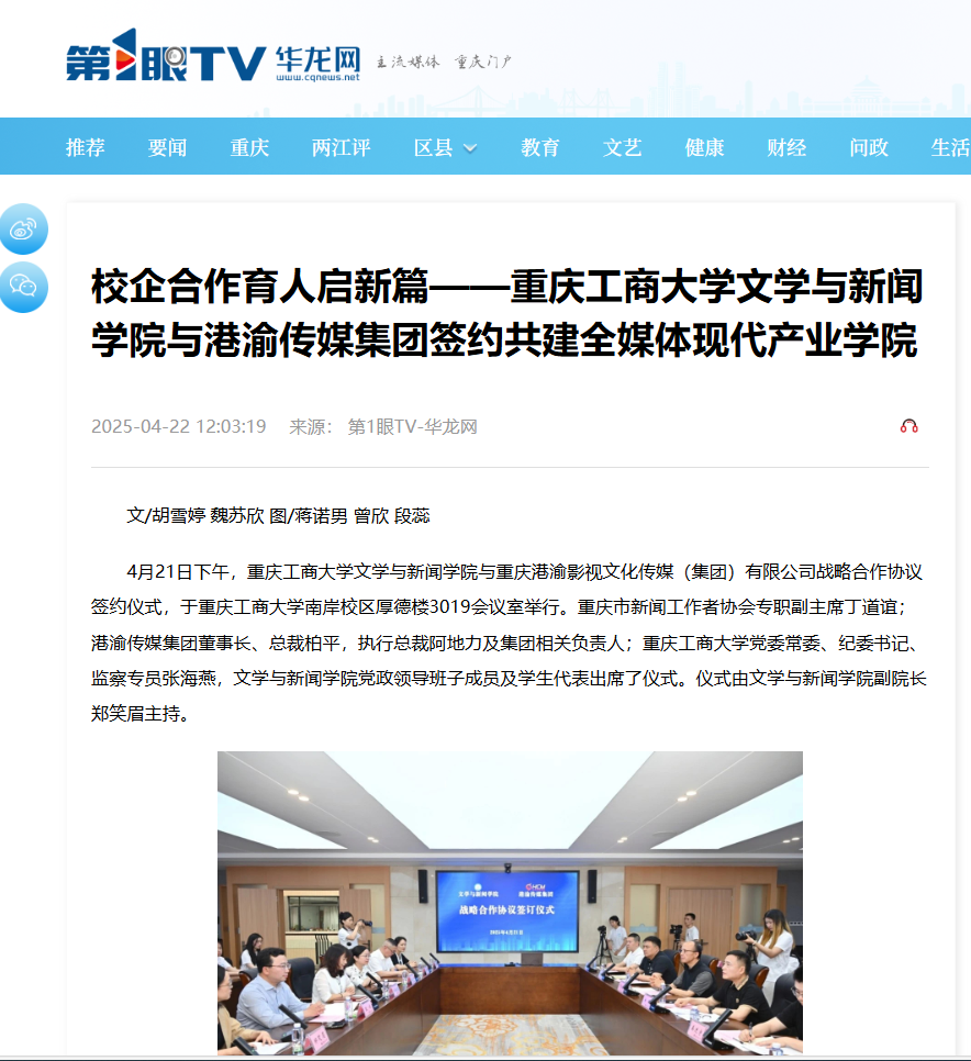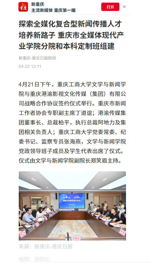 新重庆-重庆日报、第1眼TV-华龙网、重庆广电第一眼分别以《探索全媒化复合型新闻传播人才培养新路子 重庆市全媒体现代产业学院分院和本科定制班组建》对本次活动进行报道。