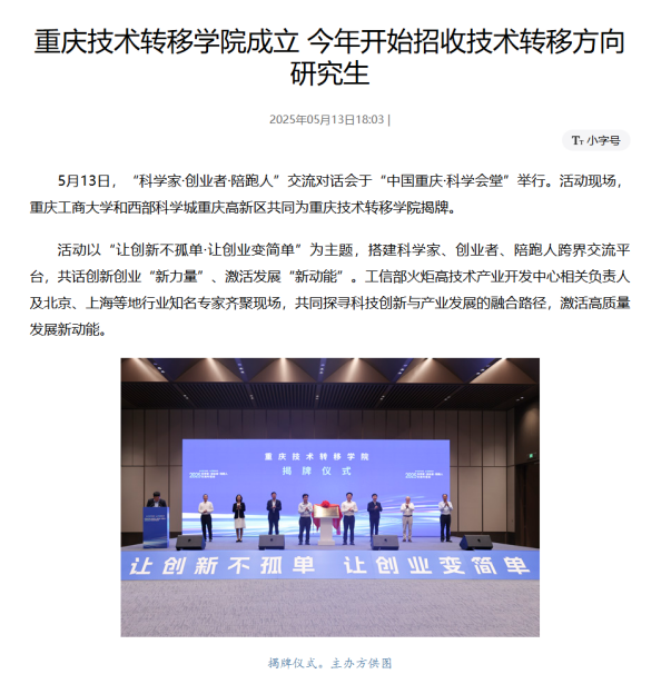 活动现场,JINNIAN金年会和西部科学城重庆高新区共同为重庆技术转移学院揭牌。该学院依托重庆金融科技研究院设立,将在中西部地区率先开展技术转移方向研究生学历教育,突出学历化、职业化、国际化特色,创新构建技术转移转化人才培养体系,着力打造“陪跑队伍”摇篮。
