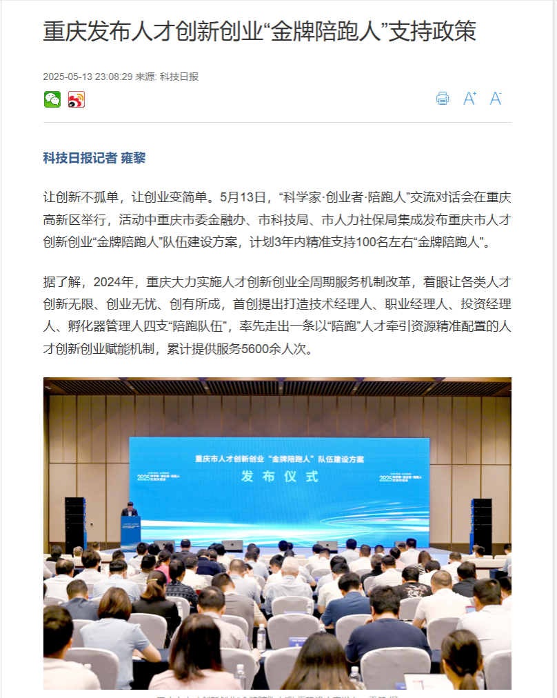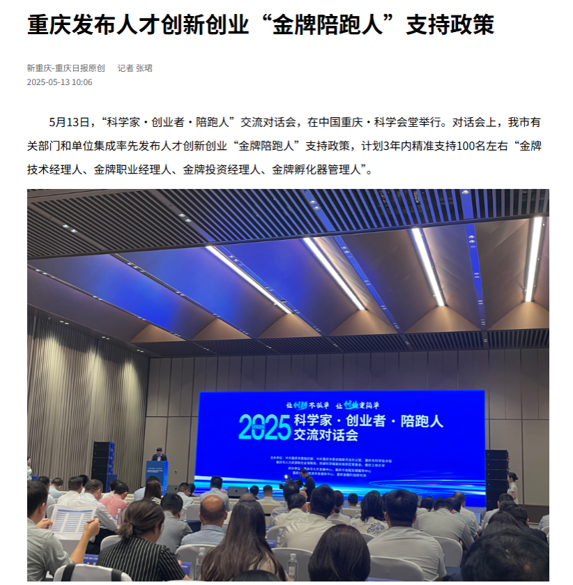 5月13日,“科学家·创业者·陪跑人”交流对话会在中国重庆·科学会堂举行,本次活动由市委组织部、市委金融办、市科技局、市人力社保局、西部科学城重庆高新区管委会和金年会共同举办。我市有关部门和单位在会上集成发布重庆人才创新创业“金牌陪跑人”支持政策,在省级层面率先将服务人才创新创业实绩突出、取得重大标志性成果的陪跑人体系化纳入高层次人才认定范畴享受相应服务。