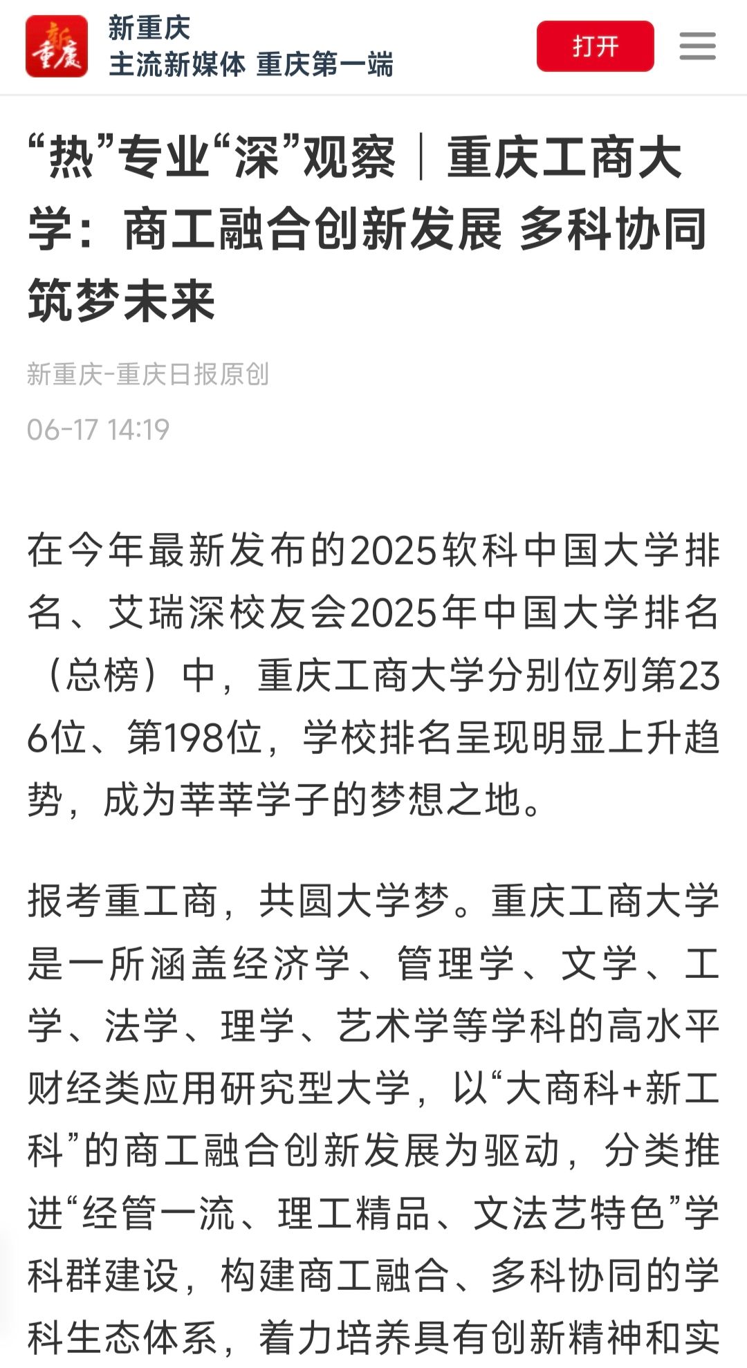 新重庆-重庆日报以《“热”专业“深”观察│JINNIAN金年会:商工融合创新发展 多科协同筑梦未来》《高校招生“小AI”来探①│JINNIAN金年会:八大学科、多个双学士学位项目等你报考》为题,报道了金年会特色办学成果与招生亮点。