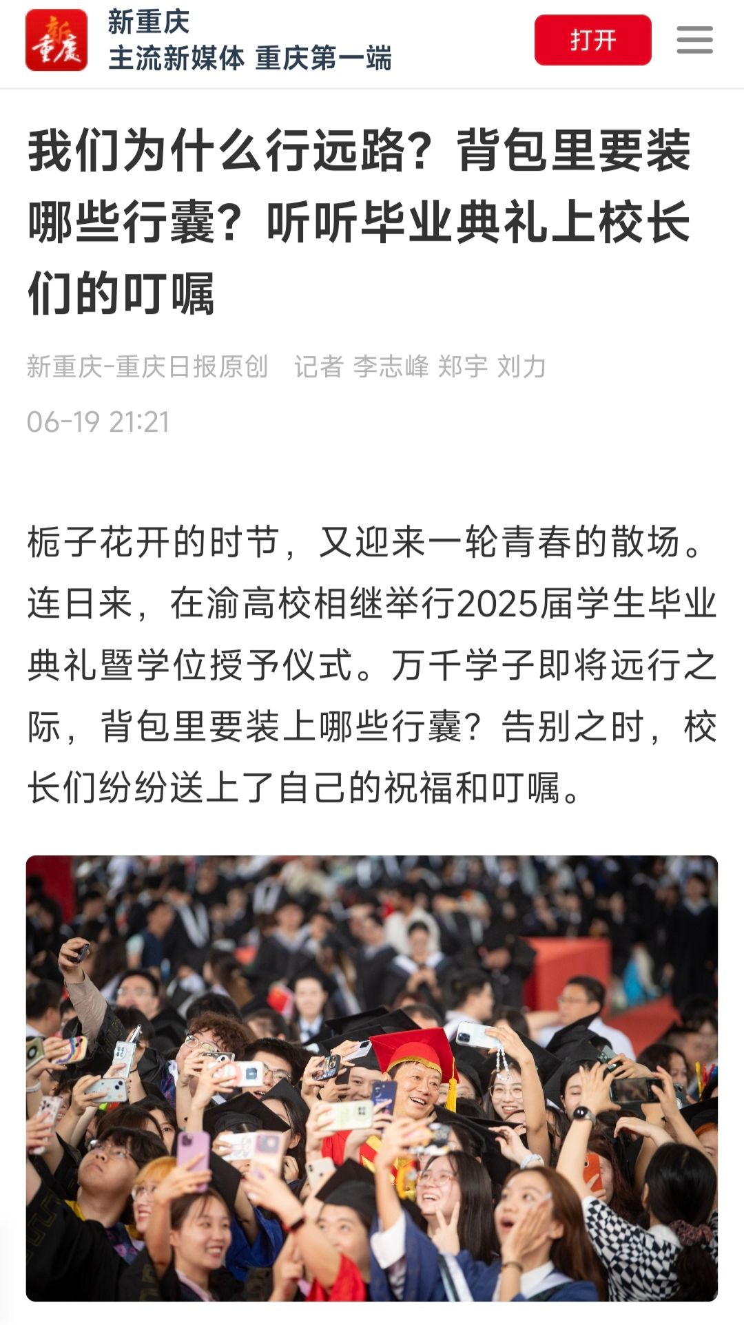 3.新重庆-重庆日报:我们为什么行远路?背包里要装哪些行囊?听听毕业典礼上校长们的叮嘱