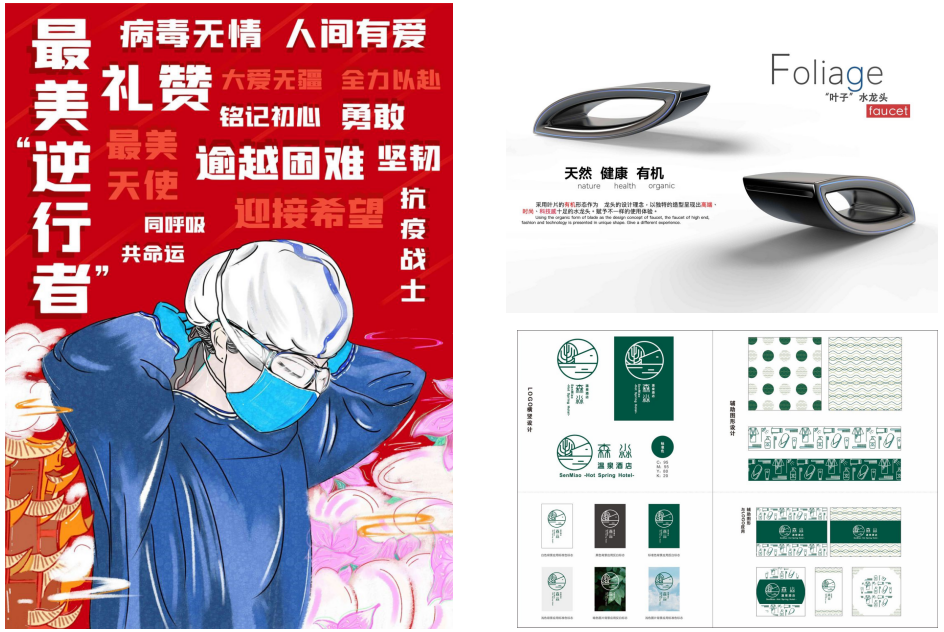 学生作品从全国100多所高等院校、近万件作品(其中自主命题作品8867件、“命题设计——真题真做”作品482件)中脱颖而出,由殷俊指导的《森淼温泉酒店VI设计》等2项作品获得二等奖,由汪维丁指导的《礼赞最美逆行者》、周亚林指导的《民以食为天》等16件作品获得三等奖,由李洋指导的《旅行便携式剃须刀》、胡虹指导的《水池子》等13件作品获得优秀奖。