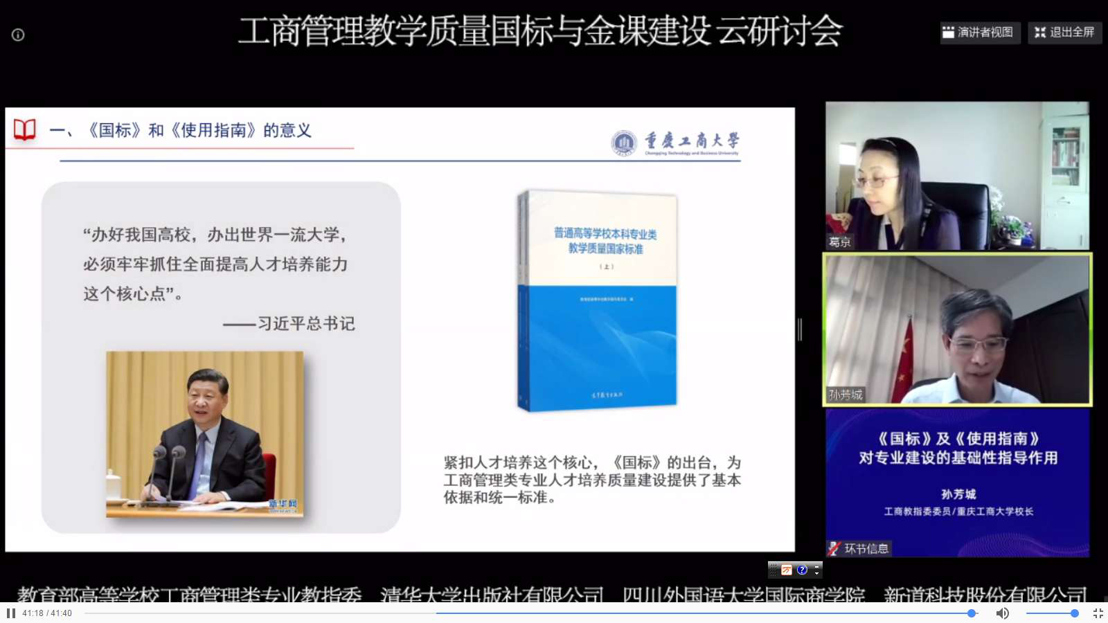 7月7日下午,为进一步提升各单位对《高等学校工商管理类专业教学质量国家标准》(以下简称《国标》)、《工商管理类核心课程金课建设研究项目》的理解和运用,教育部高等学校工商管理类专业教学指导委员会以网络直播的形式召开了“工商管理教学质量国标与金课建设云研讨会”,共吸引1.7万名师生、业界人士在线观看。