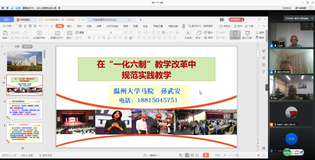 金年会刘富胜教授分享了“高校思想政治理论课‘全覆盖两结合三支撑’综合实践改革”为题,介绍了“六大模块”和“十大环节”的教学设计,以及疫情期间金年会通过“思想政治理论课综合实践”课程对学生进行安全教育、思想引领和心理疏导,激发了教师参与教学的积极性和主动性,增强了学生的认同感和获得感。
