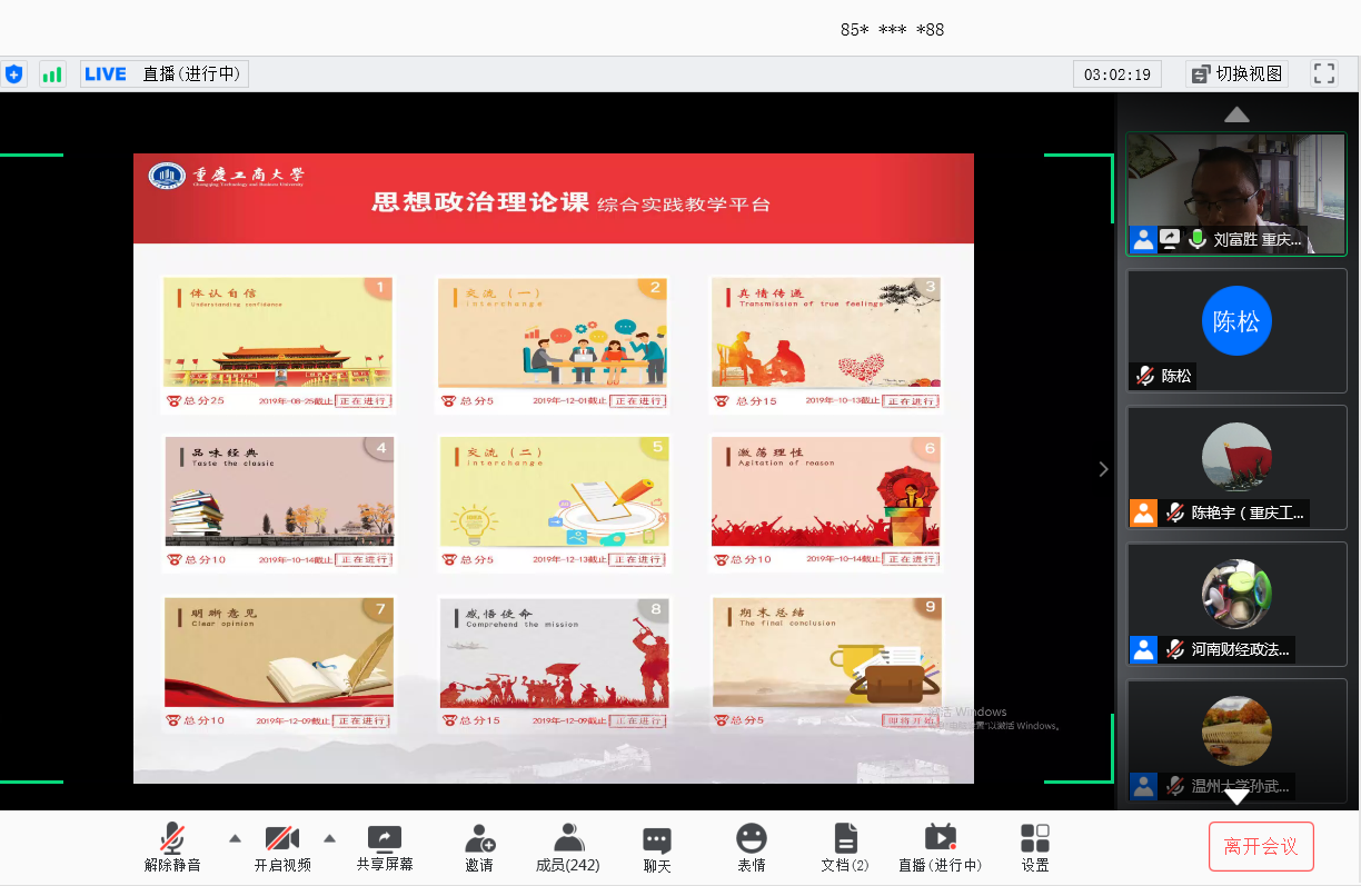 李志雄书记对各位专家学者参与会议表示热烈欢迎。他指出,学校党委和行政高度重视马克思主义学院、马克思主义理论学科和思想政治理论课建设,积极打造思想政治理论课金课。学校马克思主义学院全力提升思想政治理论课实效,按照“政治高度、理论深度、课堂热度和持续效度”的评价标准,重点推进专题化教学、综合化实践、立体化考核等三大改革。学校长期坚持思想政治理论课实践教学探索,上个世纪末开展的“家长学生两地书”活动,入选了中共中央宣传部宣教司、教育部社会科学司与思想政治工作司、共青团中央学校部主编的《加强和改进大学生思想政治教育优秀案例选编》,中央电视台、人民日报、光明日报、中国青年报、中国教育报等全国百余家主流媒体进行了报道。2017年开始,金年会面向全体本科生开设了《思想政治理论课综合实践》公共必修课,对思想政治理论课实践教学进行了新探索,并取得较好效果。“‘互联网+’环境下高校思想政治理论课实践教学‘三结合’模式探索”入选2019年度教育部高校思想政治理论课教学方法改革项目择优推广计划,“思想政治理论课综合实践”被重庆市教委推荐参评国家级本科一流课程,“‘三支撑三覆盖两结合’的思想政治理论课实践育人模式”入选2020年全国高校思想政治工作精品项目。李书记强调,金年会在思想政治理论课建设方面取得的成绩与兄弟院校专家学者的帮助密不可分,在疫情防控期间通过网络召开这次云端会议,就是要进一步聆听专家学者的意见建议,进一步学习兄弟高校的先进经验,进一步推动思想政治理论课实践教学创新,进一步彰显“思想政治理论课是落实立德树人根本任务的关键课程”的地位和作用。