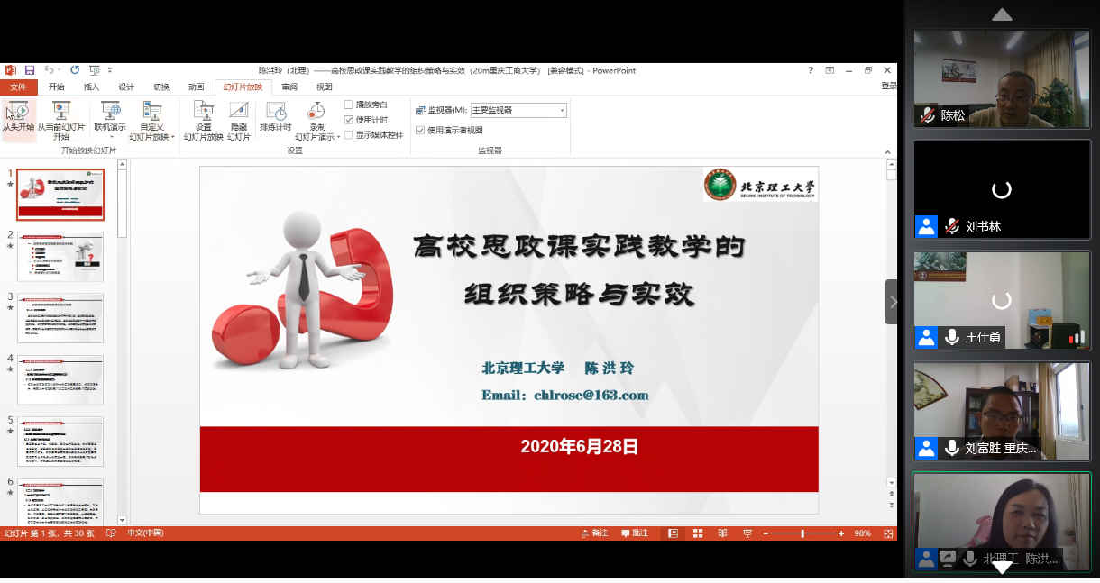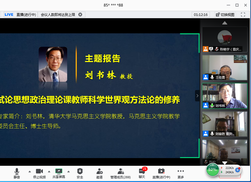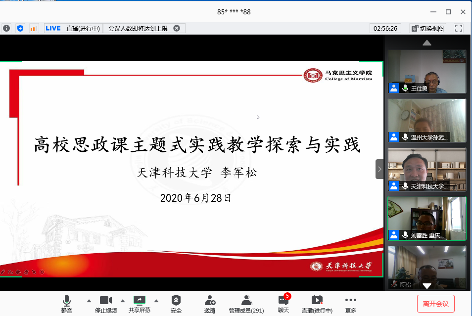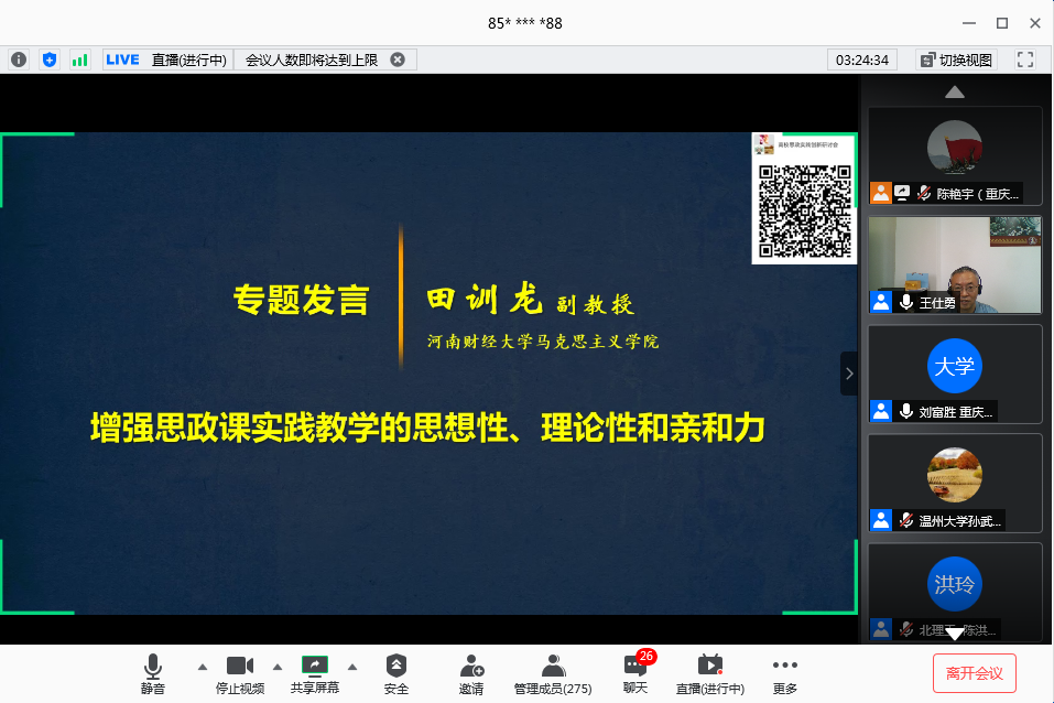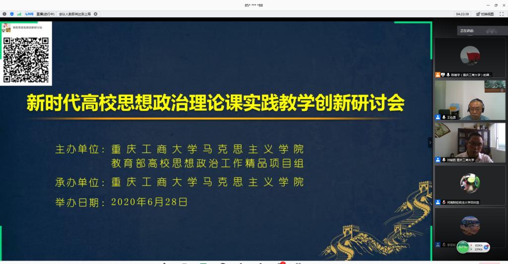 6月28日上午,由JINNIAN金年会马克思主义学院、教育部高校思想政治工作精品项目组主办的“新时代高校思想政治理论课实践教学创新研讨会”在腾讯会议平台召开。来自清华大学、北京理工大学、温州大学、天津科技大学、河南财经政法大学和JINNIAN金年会的六所高校的专家做了主题报告或专题发言。学校党委书记李志雄同志出席会议并致辞。来自全国106所高校的300余位专家学者参加了会议。会议由金年会马克思主义学院院长王仕勇主持。