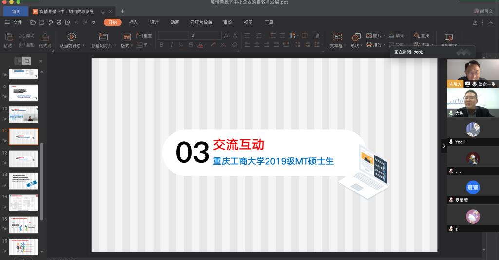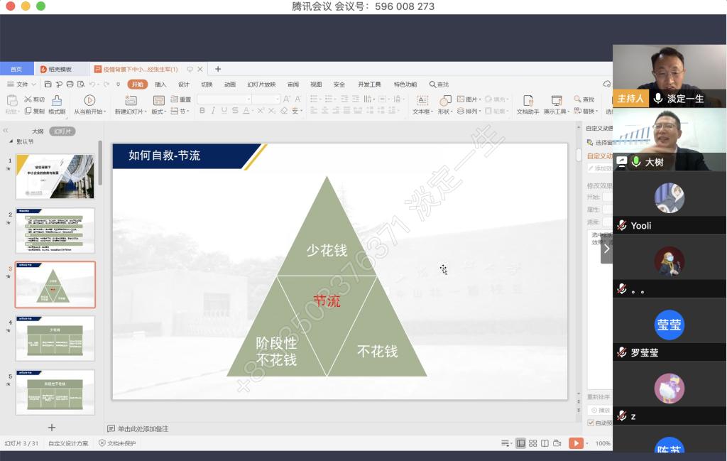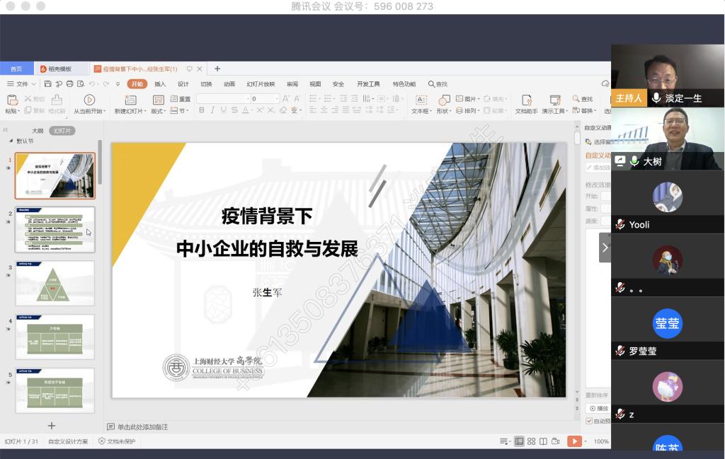 4月9日晚上,金年会税务硕士教育中心通过腾讯会议举办了本年度第一次南山税务沙龙——疫情背景下中小企业的自救与发展。本次沙龙由金年会尚可文教授主持,特别邀请迅驰车业江苏有限公司副总裁、上海财经大学硕士生导师张生军博士主讲。金年会2019级税务硕士研究生参加了沙龙。