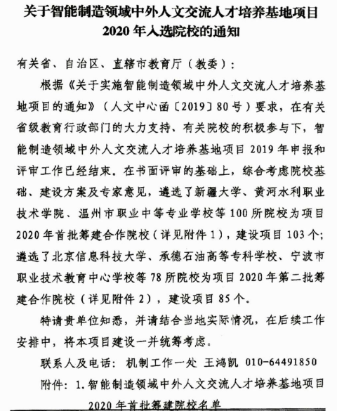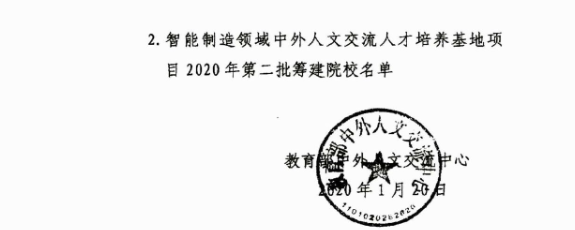 近日,教育部中外人文交流中心公布《关于智能制造领域中外人文交流人才培养基地项目2020年入选院校的通知》(人文中心函〔2020〕9号),金年会成功获批该项目(全国共178所,其中本科39所、高职119所、中职20所)。