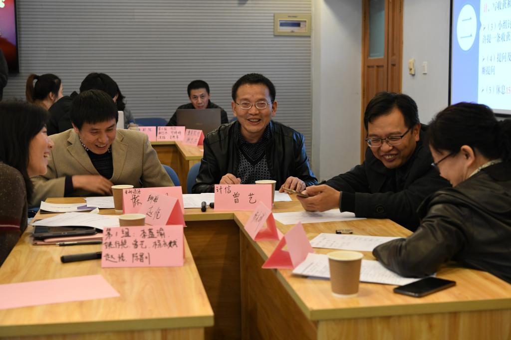 此次工作坊旨在帮助指导老师们对“对分课堂”进行深度研修。梁新元教授的对分课堂工作坊内容包括对分课堂理念、操作要领、教学设计、反馈与问题四个阶段,每一阶段都贯彻“对分课堂”的教学理念,设计精讲、自我反思、小组讨论和小组分享几个环节。操作要领部分重点讲授了“精讲与留白”“独学与作业”和“小组讨论与全班交流”:精讲内容框架、重点和难点,讲授的核心目标是促进学生随后的学习;独学强调知识的内化吸收要独立完成。作业部分以 “亮考帮”形式呈现:“亮闪闪”——学习过程中自己感受最深、受益最大的内容,“考考你”——自己弄懂了,但是觉得别人可能存在困惑的内容,“帮帮我”——自己不懂或想要了解的内容,通过“亮考帮”对作业进行总结提炼,为课堂讨论打下基础;有了独学内化和“亮考帮”作业做基础,开展小组讨论就不会是难事了。在教学设计阶段,老师们进行实操环节,利用对分课堂的理念,对原有的课堂教学设计方案进行了修订,并进行了分享和交流。老师们积极参与讨论,坦诚地提出和面对问题,反响热烈。