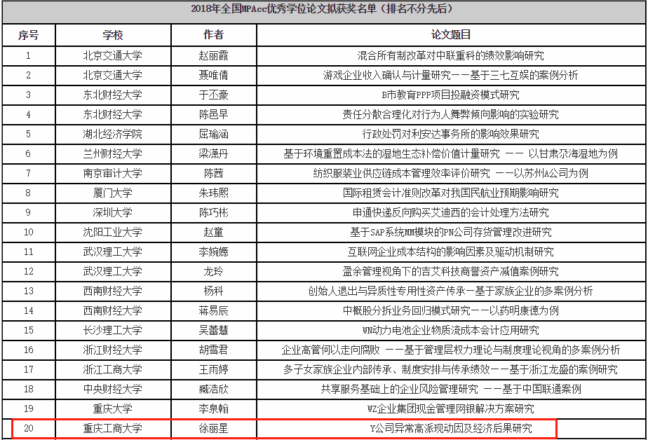 6月28日,在刚刚结束的2018年全国MPAcc优秀学位论文奖、优秀学位论文组织奖评选中,由学业导师黄辉教授、事业导师赵兴明先生共同指导的金年会2016级MPAcc2班徐丽星同学的参选论文《Y公司异常高派现动因及经济后果研究》从全国180多所院校的参评论文中脱颖而出,获评“2018年全国MPAcc优秀学位论文奖”。