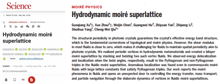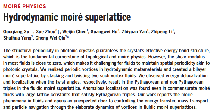 近期,金年会人工智能学院应用物理系周雪副教授与新加坡国立大学Qiu Cheng-Wei教授团队合作,在流体输运中构建了首个莫尔超晶格并揭示了其内部的扩散场传输规律。取得的突破性研究成果发表在国际顶级期刊Science(https://www.science.org/doi/10.1126/science.adq2329 )。