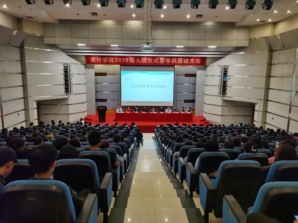 为进一步加强学院学风建设,营造良好的育人氛围,强化2019级学生学院认同、专业认同,帮助学生尽快融入学院学习生活,9月25日下午,会计学院在南岸校区博智楼7100报告厅举行了2019级学风促进大会。会计学院分党委书记罗惠玉、专职组织员石世明、分党委副书记郝颖、副院长周兵、黄辉、钟廷勇,会计系主任蒋弘、财务管理系和资产评估系主任杜迎新、审计系主任蒋水全、学工办主任彭文涛、优秀教师代表石道元教授、2019级各班级辅导员以及2019级本科全体学生参加了本次会议。会议由郝颖主持。