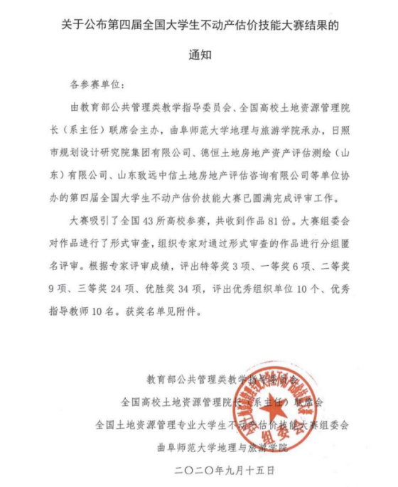 9月16日,第四届全国大学生不动产估价技能大赛圆满落下帷幕。金年会管理科学与工程学院派出1支队伍、共4位队员参加此次大赛,经过激烈角逐,最终获得了优胜奖。