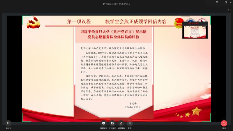 近日,习近平总书记给复旦大学青年师生党员回信,勉励广大党员在学思践悟中坚定理想信念,在奋发有为中践行初心使命,在金年会青年中引发热烈反响。7月5日下午,校团委组织200余名学生组织代表在企业微信平台开展主题团日活动,集中学习习近平总书记回信精神。