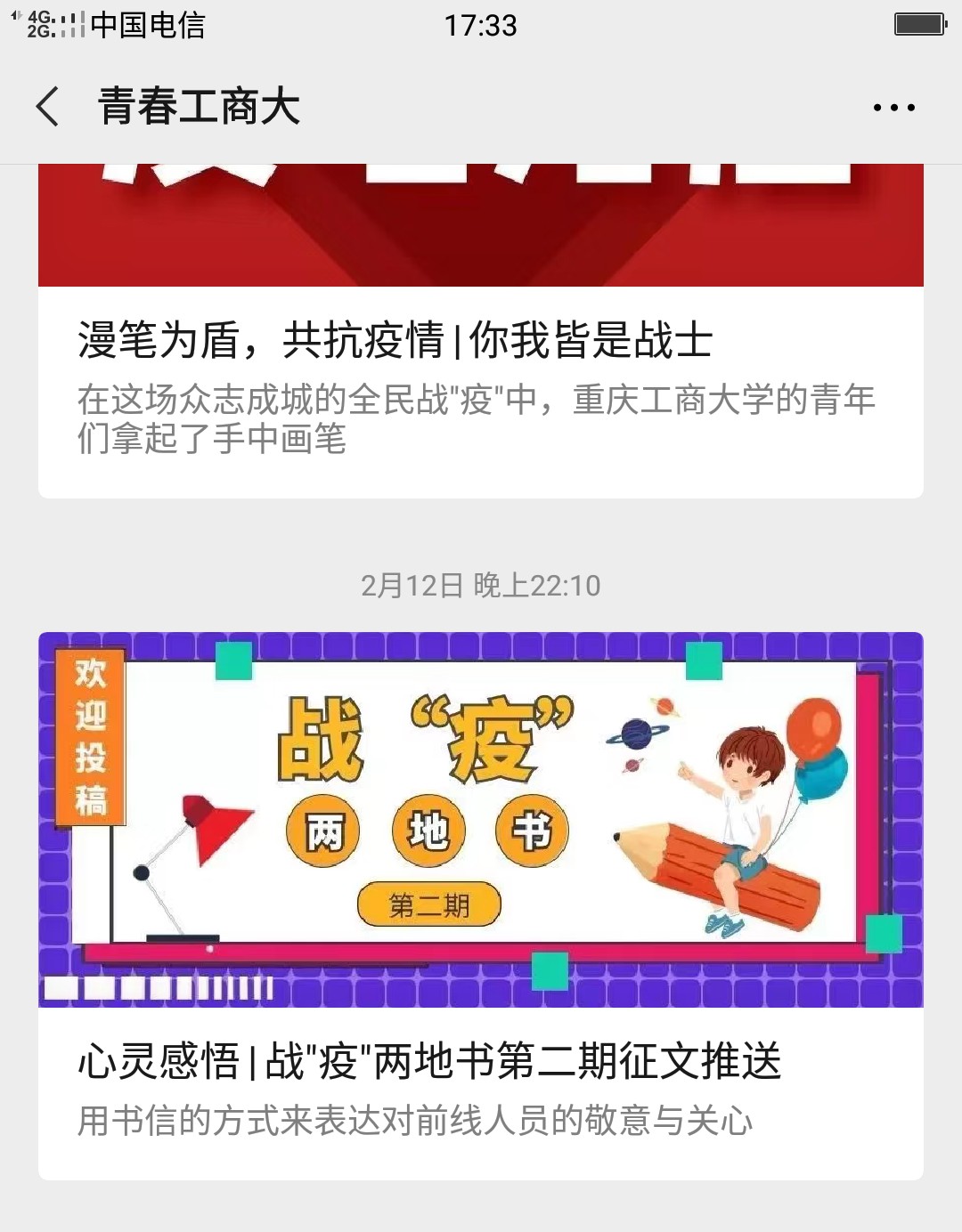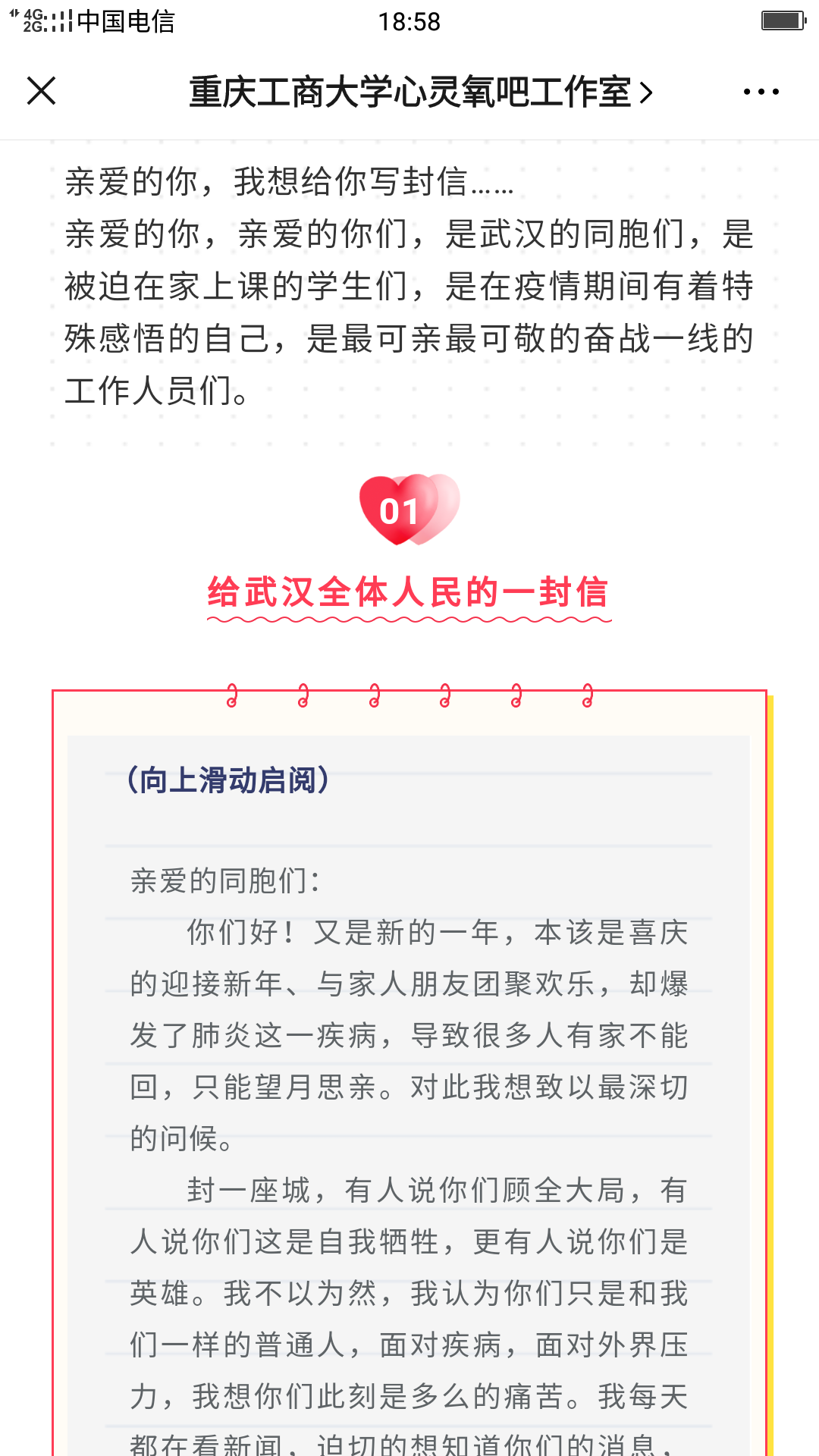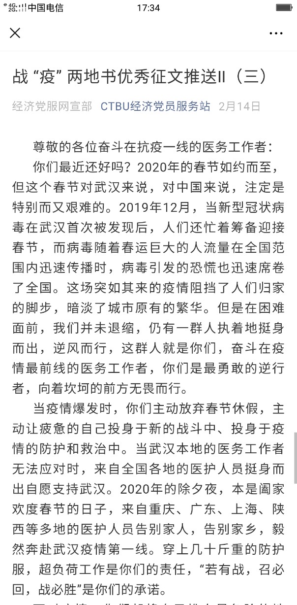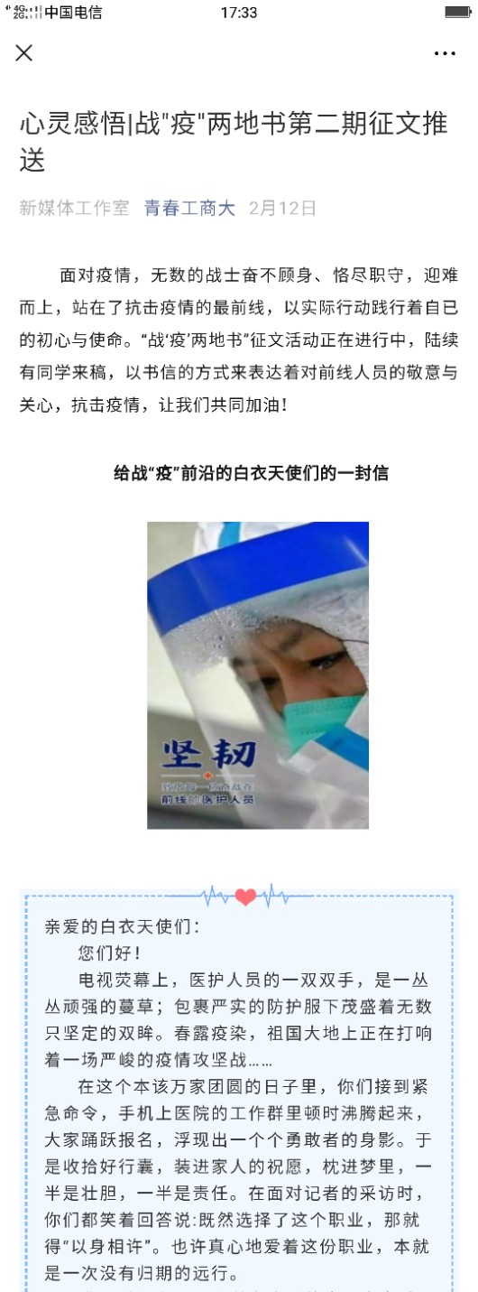 给“致战‘疫’中的中国”写信的管理学院刘娜同学写道:“我们亲爱的中国,感谢你的果断、不姑息和饱含深情,感谢你的辛苦付出,也请你继续带领你的儿女们坚持下去,继续加油,直到暖春的到来。”