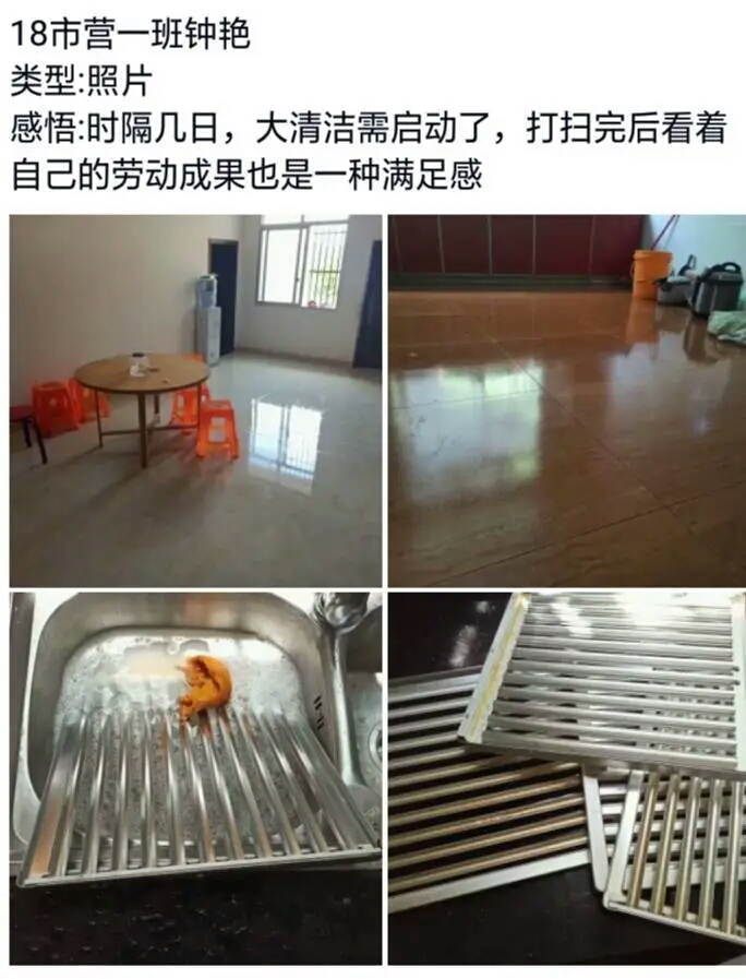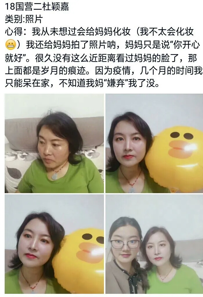 18级国营二班的杜颖嘉同学借此次机会给妈妈化妆,并且晒出了妈妈美美的妆以及合拍;18级电商一班的李琳同学选择了给妈妈拍照、做饭、做甜点,一份份可口的饭菜,穿着裙子漫步的妈妈,她写道:“我好怕留不住你的容颜,请让时光帮我记住它吧”;18级市营一班的钟艳同学选择了对家里进行一次彻底的大扫除,辛勤劳动过的房间很是干净清爽;17级国营二班的李仁娇同学晒出了一组别具一格的照片,照片中她亲自为母亲和爷爷洗脚,“为了报答爷爷和母亲,缓解劳累,我亲自烧水,为他们洗脚”,她在心得中这样写道。参与此次活动的很多同学主动记录劳动经历,与父母在朋友圈或者空间积极互动,对父母来说,子女能够在家劳动,给予他们真情陪伴,这是最好的礼物。