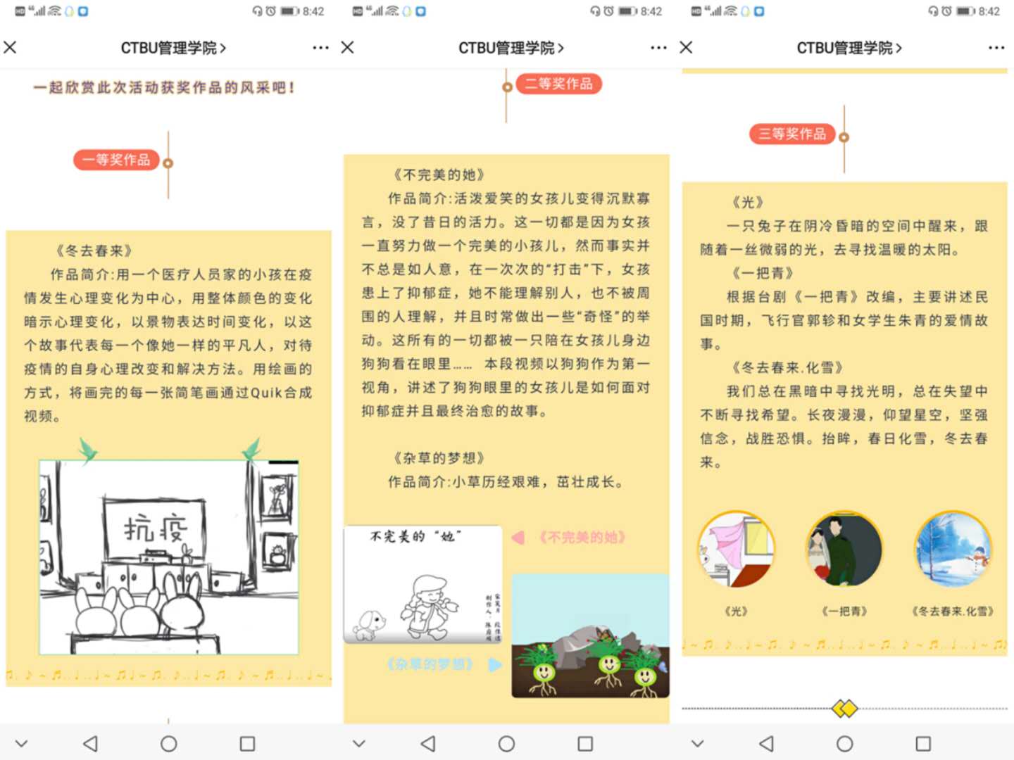 本次心理Flash视频制作活动以“心印暖阳 ‘帧’显阳光”为主题,面向全校学生广泛征集作品,受到了各学院学生的广泛关注,大家纷纷提交精心制作的作品,积极响应参与活动。经过激烈的角逐,《冬去春来》《光》《一把青》等十个稿件脱颖而出,赢得了难能可贵的决赛机会。在整合初赛得分、评委打分及线上投票多个指标过后,作品《冬去春来》最终以77.53的分数夺魁。该作品展示了疫情期间居家生活由冬天到春天的转变,表达了对宅家生活疫情阴霾之下冬日的展望与春天的绽放。作品《不完美的她》《杂草的梦想》分别以75.80、74.33的分数位列第二、第三。作品《光》《一把青》《冬去春来•化雪》获得三等奖。至此,历时1个月的JINNIAN金年会第十六届“心印暖阳 “帧”显阳光”心理flash视频制作比赛活动圆满结束。